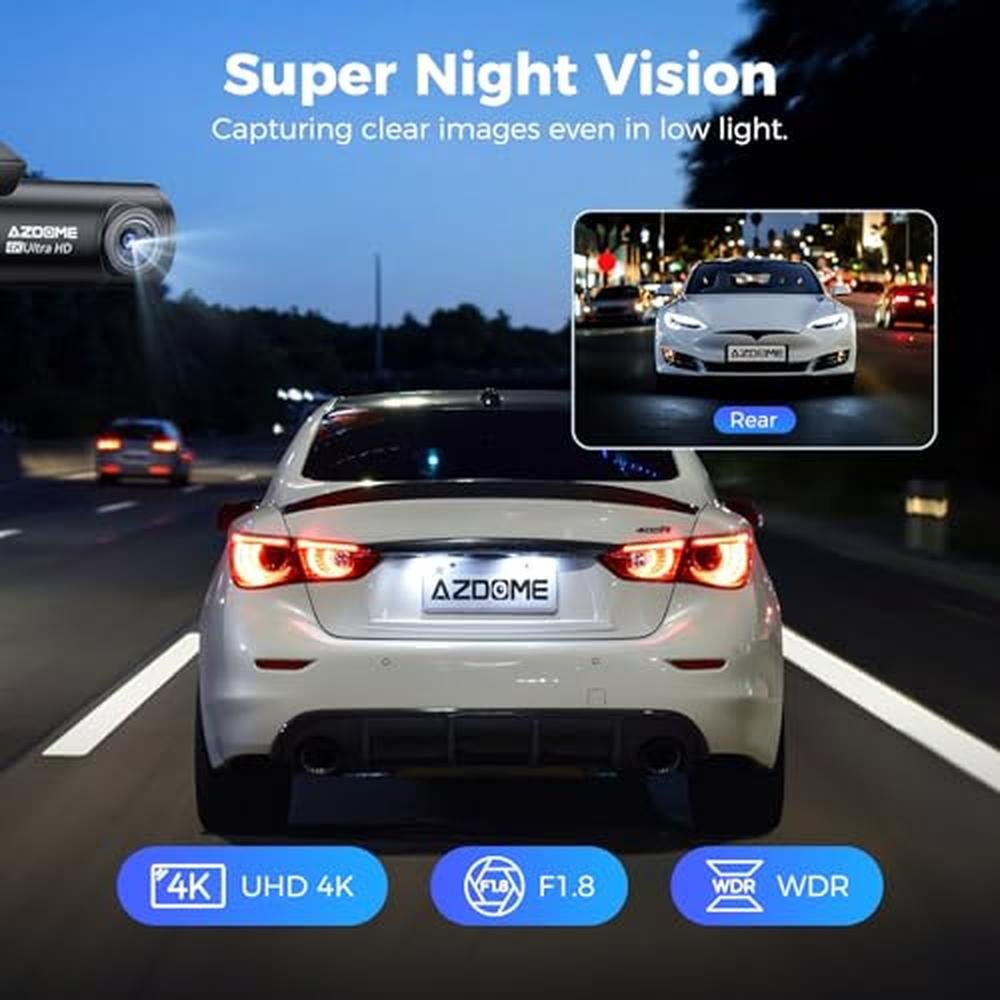 - AZDOME M300S 4K Ultra HD Dual Dash Cam features front and rear cameras with 4K and 1080p resolution, providing a comprehensive view of your surroundings