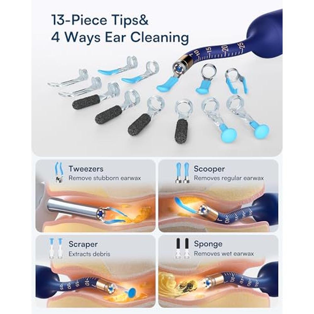 - Innovative Silicone Tube You can flexibly adjust the semi-rigid silicone tube lens according to the curve of your ear canal. And earwax removal kit with 13-piece tips of 4 types(tweezers, scooper, scraper, sponge), which can meet the whole family's cleaning needs, whether you have wet or dry ears. Say goodbye to risky cotton swabsredefine personal hygiene with confidence!