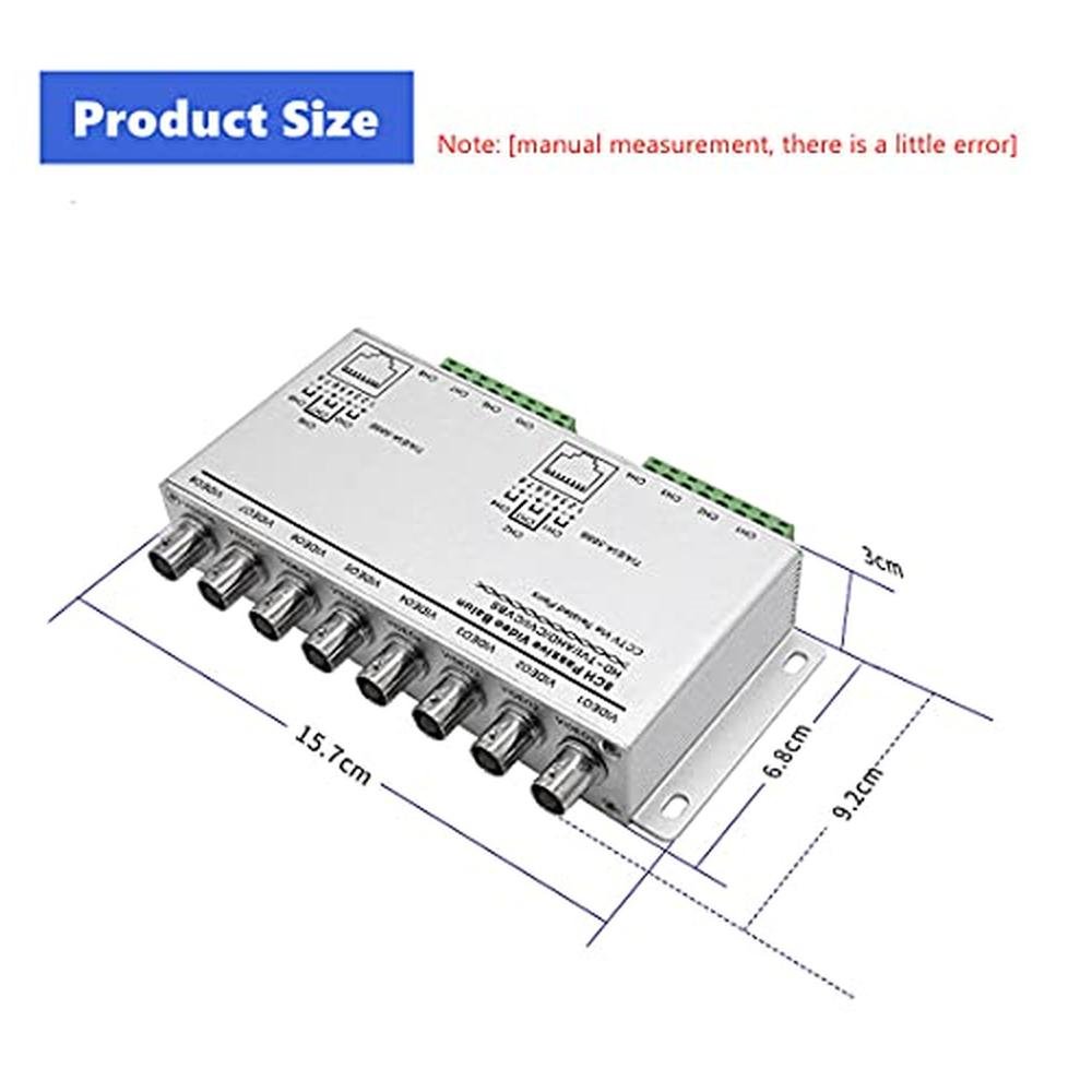 Description -Transmission Signal 8 Channel -Transmission Distance HDCVI 720400m 1080250m, HD-TVI 7201080250m, AHD 720250m 1080200m -Category Type UTCAT5 5E 6 Video Transmission Properties and Port -Compatible Format BNC-M -Twisted-pair Video Connector Push-terminal -Compatible Format HDCVI HDTVI AHD -Resolution 7201080 -Anti-interference 60d -ESD 1A contact discharge electricity level3 -Coaxial Cable Connector 2KV(common-code) Per IEC1000-4-5 -UTCable Connector 2KV(different-code),4KV(common-code).Per IEC1000-4-5 -Impedance BNC Mother-75ohms -Dimension(L W H) 180 52 25mm Shell Material ABS Aluminium Alloy Shell , Color Silver, Net Weight 380g MTBF 10000H -Operating Temperature -10 C-55 C, Storage Temperature -20 C-70 C -Humidity 0-95 (non-condensing). Cable Recommendation Link cable is recommended to use high quality UTcable. Poor quality cable or network connection or improper construction will cause unstable connection,video or sound disruptions,picture noise appears. Note The transceiver is not waterproof set,so keeping transceiver away wet environment will be prefer -Suggest to use the transceiver indoors.When installing the transceiver in outdoor,please install it in a waterproof place. Package Included 1 x 8-CH Passive HD Transceiver 1x Manual