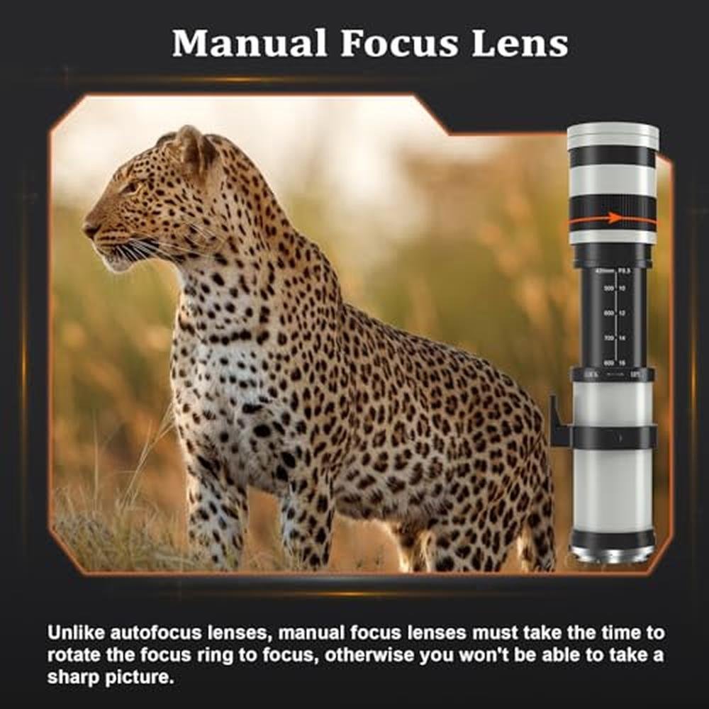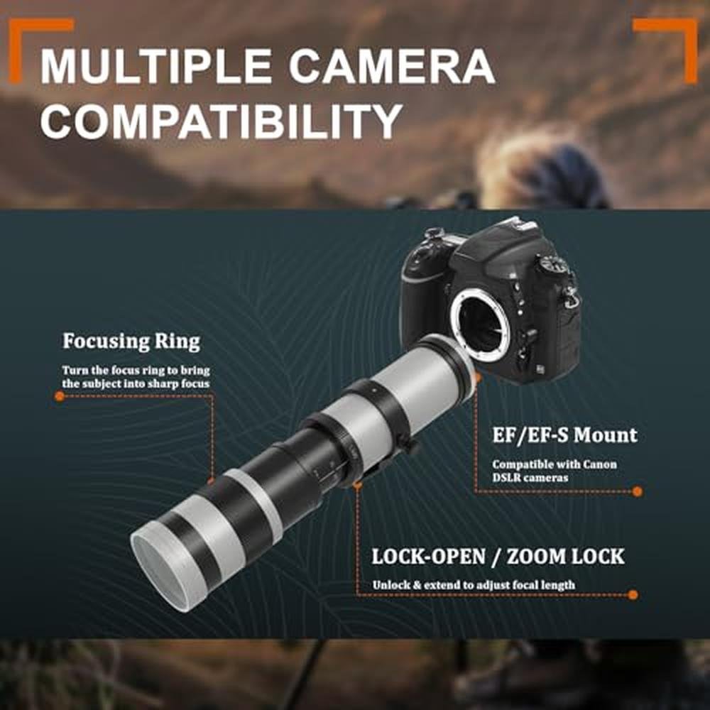Indulge in the world of professional photography with the BENOISON 420-800mm Telephoto Lens, meticulously designed for Canon EF mount DSLR cameras. As a top-tier choice for Canon lens enthusiasts, this manual focus MF zoom lens is compatible with a wide range of Canon EOS models, including the Rebel SL3, SL2, SL1, T8i, T7i, T7, T6, 4000D, 1500D, 90D, 80D, 77D, 70D, 60D, 7D, 6D, 5D, and 1D. Whether you're seeking the best lens for Canon or looking to upgrade your existing Canon EF lens, this premium-grade telephoto lens is an excellent choice. With its advanced optical design and superior craftsmanship, it delivers exceptional image quality and unparalleled performance. Experience the thrill of capturing stunning images with this high-end telephoto lens, perfect for wildlife, sports, and landscape photography. Elevate your photography skills and unlock new creative possibilities with the BENOISON 420-800mm Telephoto Lens.