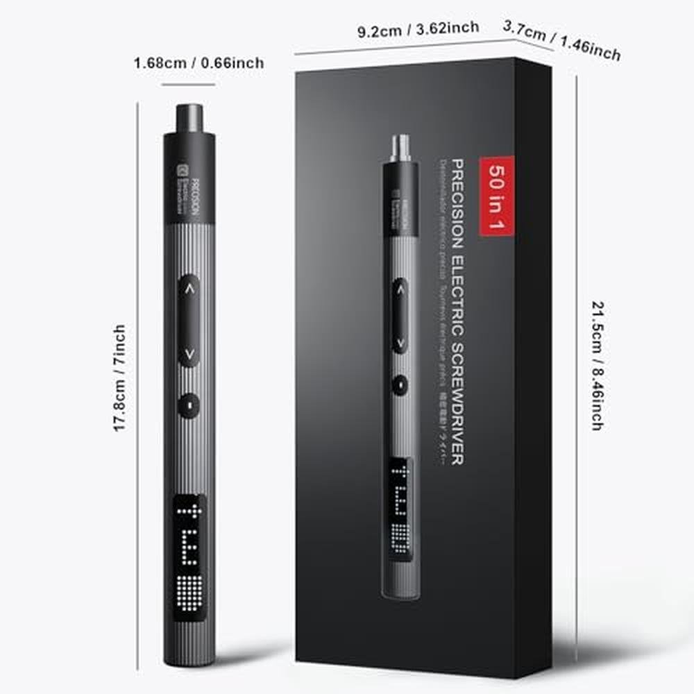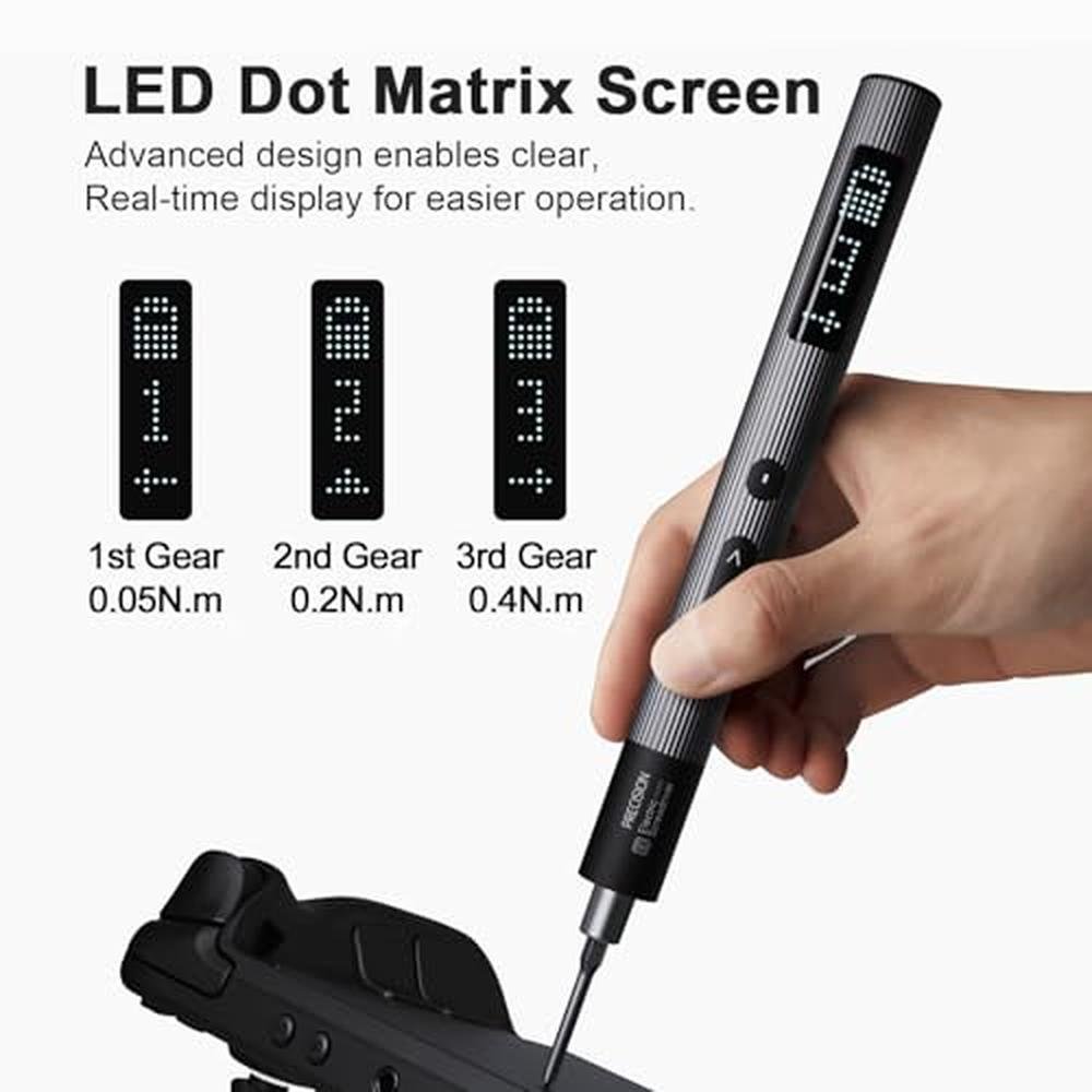 - All-metal gearbox with built-in strong magnets, achieving an idle output speed of 240 r/min and torque of 0.4 N.m for efficient and stable performance.- Innovative dot matrix screen, cutting-edge design offers a clear, intuitive user experience with real-time display of work status for smoother operations.- LED lights activate during work, allowing clear visibility of screw alignment even in dim environments.- Silicone buttons provide a comfortable feel; lightweight triggering with automatic brake enhances safety and ease of use.- USB-C charging port, commonly found in popular electronics, compatible with most current chargers for convenient charging.