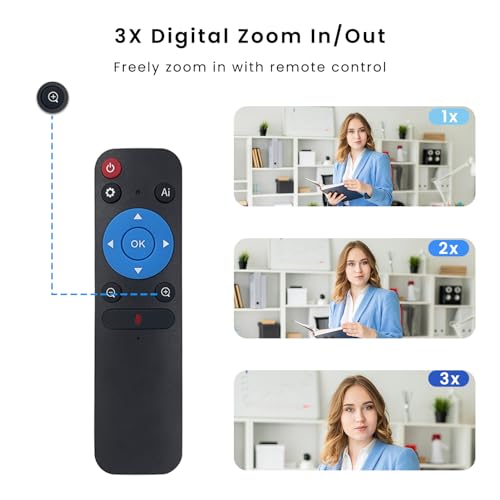 - Remote control with one-touch mute, screen management, and 3X digital zoom capabilities