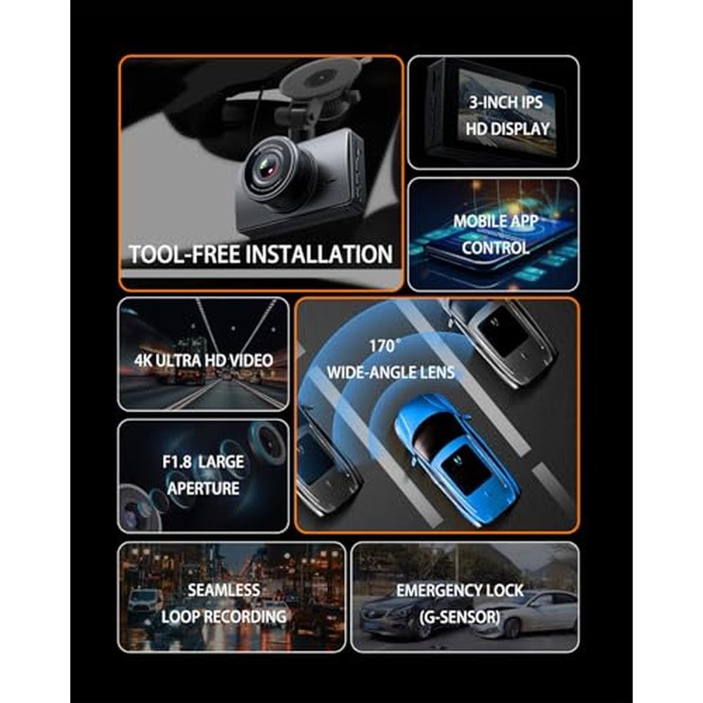Special features Built-In 5Ghz WiFi,4K Front and Rear Dual Cams, 3.0" IPS Screen, App Control,Loop Recording, Night Vision,18-Month Reliable Warranty, Automatic Incident Detection, Loop Recording, G-sensor, Parking Monitor, Audio Recording,WDR, Internal Memory, Free 32GB Memory Card, G-Sensor, Compact Design,Support 256GB max