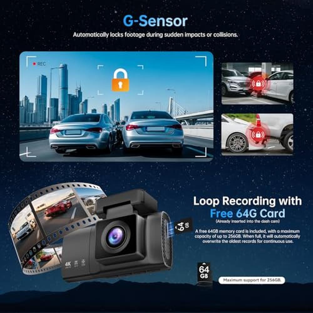 Indulge in the pinnacle of in-car surveillance with our sophisticated dash camera, meticulously designed to provide unmatched protection and peace of mind on the road. As a premium dash camera for car front and rear, our 3-channel 4K dash camera captures exquisite footage from multiple angles, including the front, rear, and interior of your vehicle. With seamless dash camera installation, you can enjoy advanced features like 5GHz WiFi, IR night vision, and WDR technology. Plus, with a complimentary 64GB card included, you can record hours of footage without worrying about storage space. Our dash camera boasts a refined design, ensuring a superior driving experience.