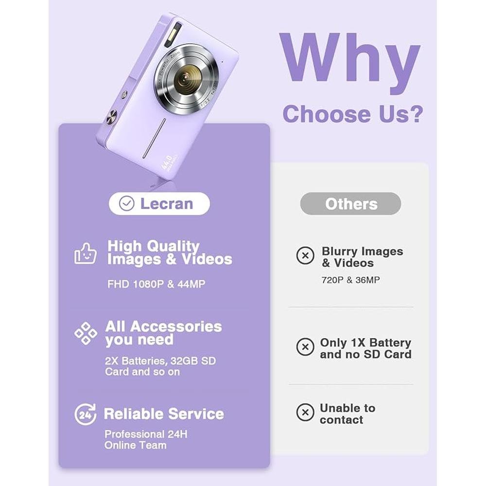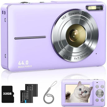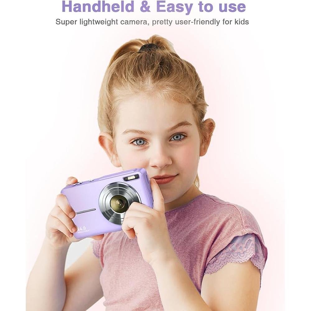 - MEANINGFUL GIFT - This purple digital camera for kids is equipped with a high-level CMOS Sensor and anti-shake function, which helps to capture vivid clear 44MP Images and record stable smooth FHD 1080P resolution videos. Its a meaningful Christmas or birthday gift camera for kids to cultivate their interest in photography, experience the lovely life, and leave funny memorable moments with family or friends.