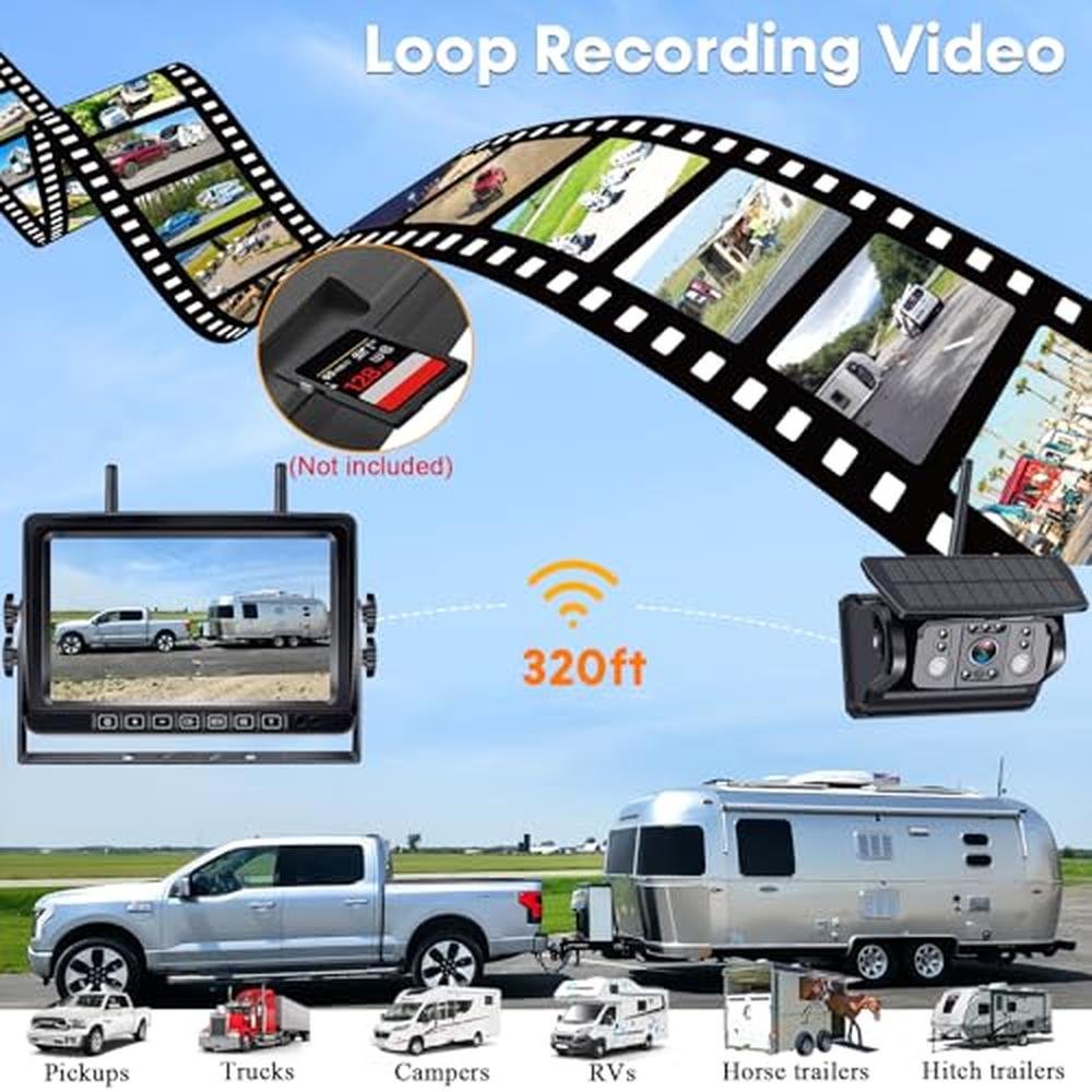 Indulge in enhanced rearview visibility and safety on the road with our premium Dual RV Wireless Backup Camera for Trailer, meticulously designed for effortless setup and seamless integration with your camper, truck, or fifth wheel. This sophisticated dual camera system features a 7-inch recording monitor, supporting up to 4 channels, and boasts strong magnetic HD 1080P cameras for crystal-clear video quality. With its long-battery life and solar-powered design, you can enjoy uninterrupted monitoring without worrying about power drainage. Ideal for RV owners seeking a reliable and easy-to-install dual camera night vision setup, our product offers a comprehensive solution for elevating your driving experience. Whether you're looking for a dual camera security system kit for your vehicle or a dual camera adapter for enhanced visibility, our wireless RV backup camera is the ultimate choice.