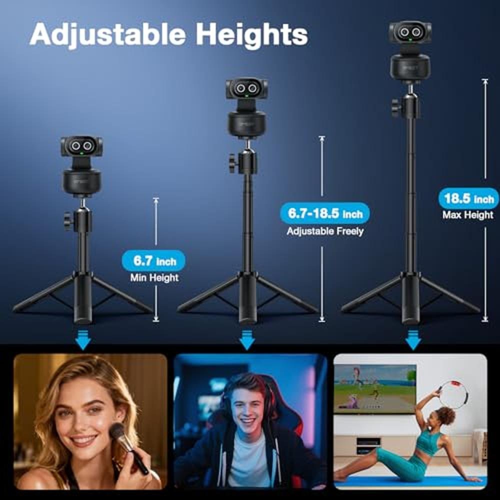 - Adjustable Tripod for Flexible Streaming Angles The included tripod in PIXY Kit adjusts from 6.718.5" with a 360 swivel head, making it ideal for capturing portrait or landscape shots during live content creation. Whether youre recording close-ups, full-body fitness, or multi-angle online meetings, this tripod ensures stable, pro-level framing. The universal 1/4" screw fits most 4K webcam for streaming, streaming camera, action cam, and DSLR setupsno extra holder needed.