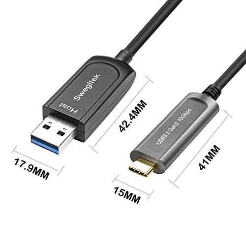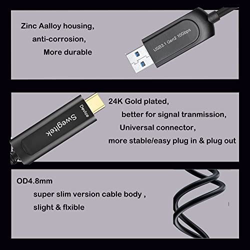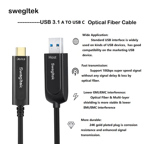 Experience the ultimate in high-speed data transfer with our Fiber Optic USB A to USB C Cable, designed to deliver lightning-fast speeds of up to 10Gbps. As a leading solution for industrial and commercial applications, this 50ft cable is perfect for connecting devices such as industrial cameras, machine vision systems, medical security equipment, broadcasting devices, printers, scanners, touch screens, and game controllers. With its robust fiber optic construction, this cable provides a reliable and stable connection, immune to electromagnetic interference and signal degradation. Whether you're looking for a premium cable fiber internet solution or seeking to upgrade your existing infrastructure, our Fiber Optic USB A to USB C Cable is the ideal choice. Its compatibility with Swegltek optical fiber USB3.1 data extension cable uses OM3 10 gigabit optical fiber and photoelectric conversion chip, and has excellent performance such as lossless, radiation free, zero delay, anti-interference, etc. It is widely used in industrial cameras, security monitoring, visual robots, conference systems, etc. Please take note that this cable does not charge your device. It is meant for data transfer purposes. Make sure plug Source heading to source device such as computer, AV receiver, etc and Display heading to Monitor, Projector or TV are plugged in. Otherwise it will NOT work.