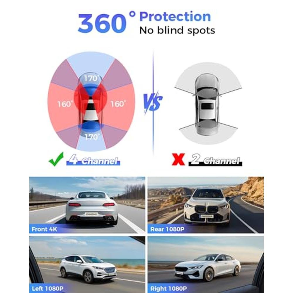 FREEXAR 4K 360 Dash Cam | 4-Channel Dash Camera for Cars with GPS, Wi-Fi, and Night Vision | Total Protection with No Blind Spots