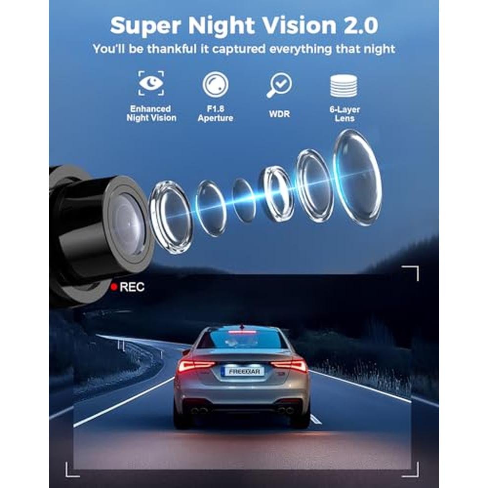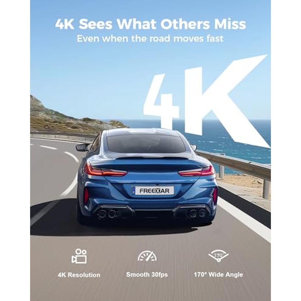Experience the ultimate in road coverage with the FREEXAR 4K 360 Dash Cam, a premium, 4-channel dash camera designed for comprehensive protection of your vehicle. As a top choice for drivers seeking a reliable and high-end dash camera solution, this device offers full coverage of the front, rear, left, right, and inside of your car, ensuring that every angle is monitored. Equipped with advanced features such as GPS, 5.8GHz Wi-Fi, and a dedicated app, you can easily manage and review your footage. The FREEXAR D4 dash camera also boasts night vision, voice control, and a 24-hour parking mode, providing you with peace of mind. With its true 360-view, four adjustable lenses, and ultra-sharp clarity, you'll never miss a thing. The D4 car video features a 4K front camera and 1080P side channels that capture license plates and critical moments, even at highway speeds. Super Night Vision 2.0 delivers clear footage even on night driving, and the dual Type-C car charger powers the car dash cam and gives you an extra port to charge your phone. Voice control, G-sensor, and one-press lock let you save key moments instantly with a voice command, automatic impact detection, or a single tap. A free 128GB SD card is included, pre-installed and ready to go right out of the box. Built-in WiFi and a free app let you preview, download, and share clips instantly on iPhone or Android. 24/7 parking mode offers protection with impact detection and time-lapse recording that keep your car safe while you're away. GPS logging tracks your route, speed, and time, crucial when filing an insurance claim. The FREEXAR D4 dashcam is perfect for daily commuters, Uber/Lyft drivers, parents, teen drivers, students, road-trippers, and anyone who wants total driving peace of mind.