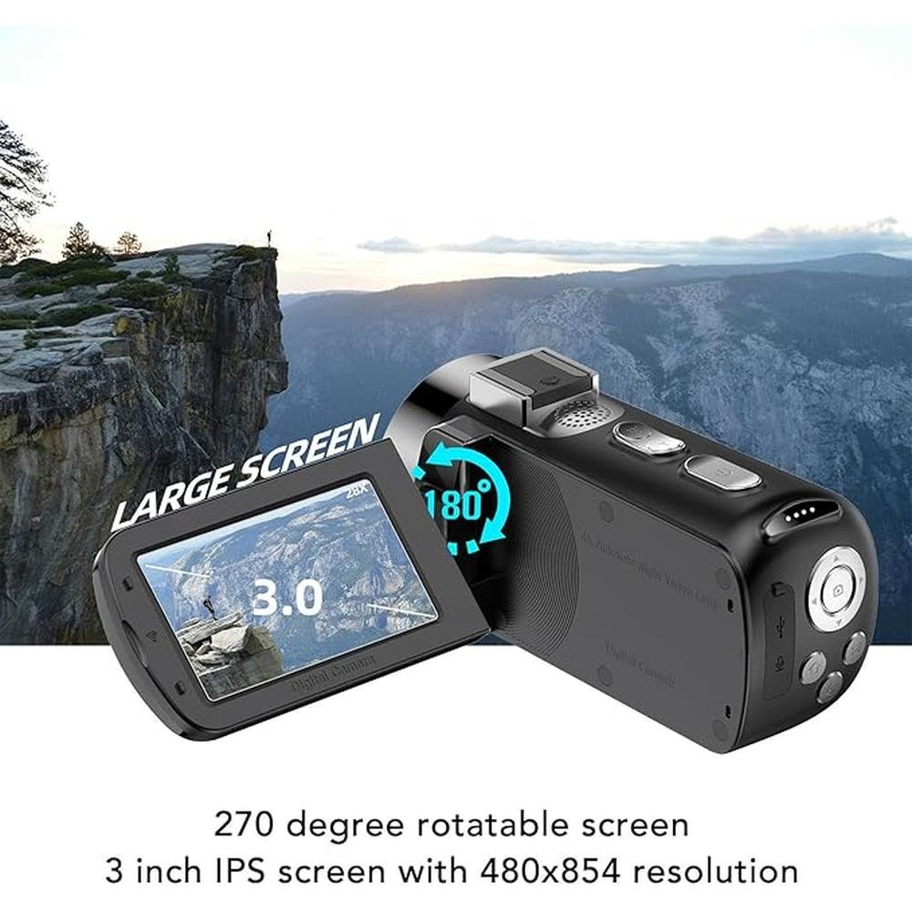1. HD 4K Imagery Featuring a high definition 4K lens with 64MP, this video camera captures breathtaking videos and images with exceptional color saturation, delivering stunning visuals even in cloudy conditions. 2. Versatile Display Screen The 3 inch screen with 480x854 resolution rotates 270 degrees for convenient selfies, supports multiple filters, and is enhanced by a high brightness LED white light for low light conditions. 3. Powerful Smart Zoom With 28x smart zoom ability, this video recorder is ideal for capturing distant objects without compromising image quality, making it ideal for sports events, family gatherings, travel, and weddings. 4. Stable Auto Focus The fully automatic autofocus (AF) feature ensures stable, clear photos. The bottom 14 inch threaded hole allows tripod mounting for enhanced stability during shooting. 5. Long Battery Life Designed to be lightweight and easily pocketable, this digital video camera houses a 4800mAh li ion battery, making it an ideal choice for travel videos and spontaneous moment captures. Specification Item Type Video Camera Material ABS Maximum Pixels 64MP (Maximum) Video Resolution 4K (Maximum) Support Small Memory Card 8GB to 128GB Small Memory Card (Not Included) Camera Battery Li Ion Battery 4800mAh (Shipped with Built in Battery) How to Use Start up and use Package List 1 x Video Camera 1 x Instruction Manual 1 x Charging Cable 1 x Cleaning Cloth