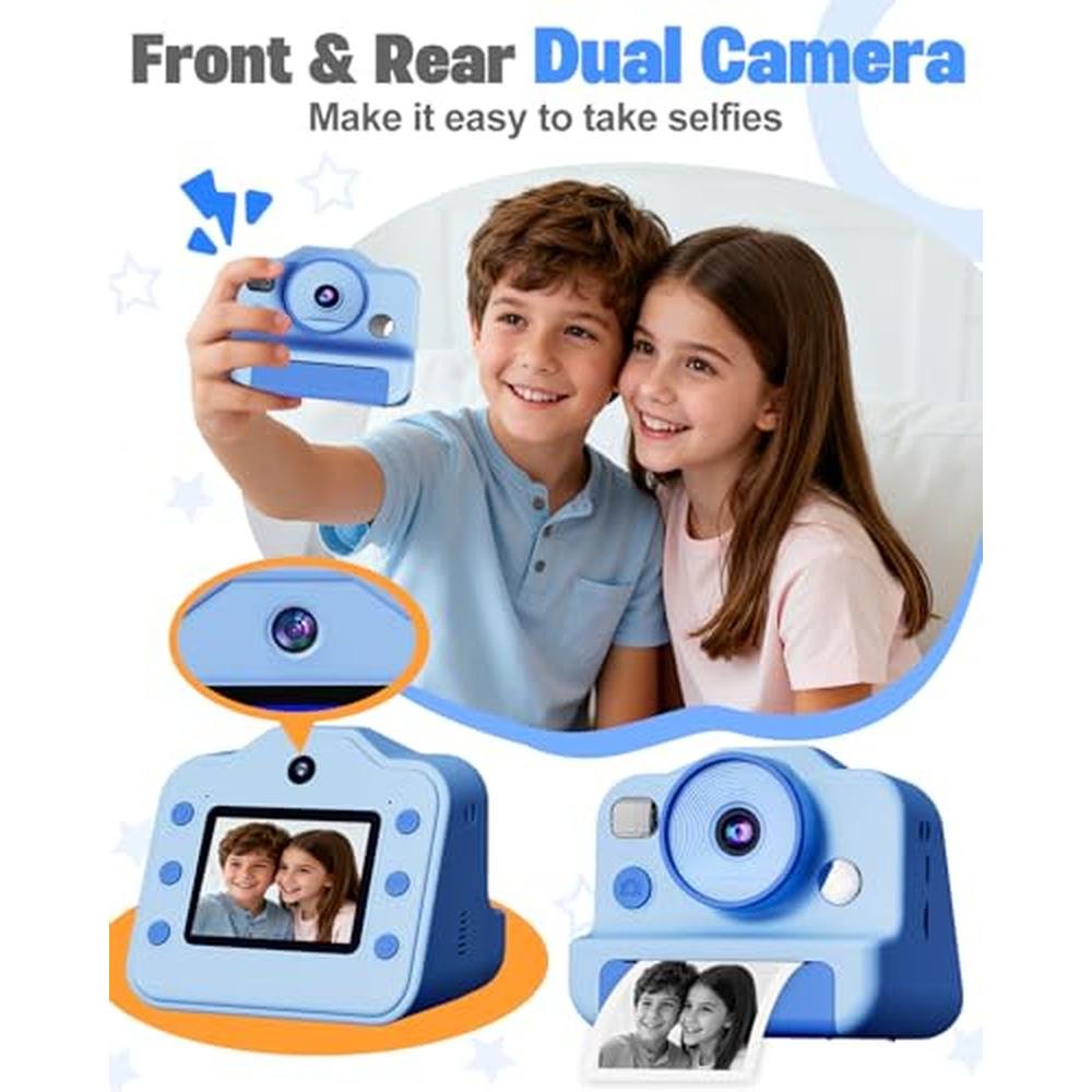 - Instant print camera for kids with 1080P video recording capability and dual selfie camera