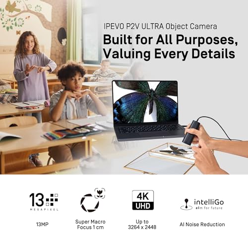 IPEVO P2V Ultra 4K/13MP Object Camera | Handheld Document Camera with 1cm Super Macro Focus and AI Noise Reduction | Premium Solution for Educators and Professionals