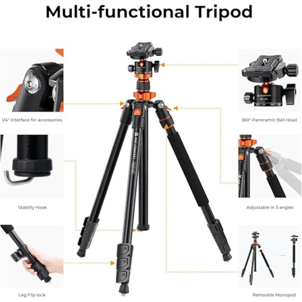 - The K&F CONCEPT 78 inch Camera Tripod features a compact aluminum design, providing a lightweight and robust platform for your camera, with a load capacity of 22lbs and a 360-degree ball head for unparalleled flexibility and support