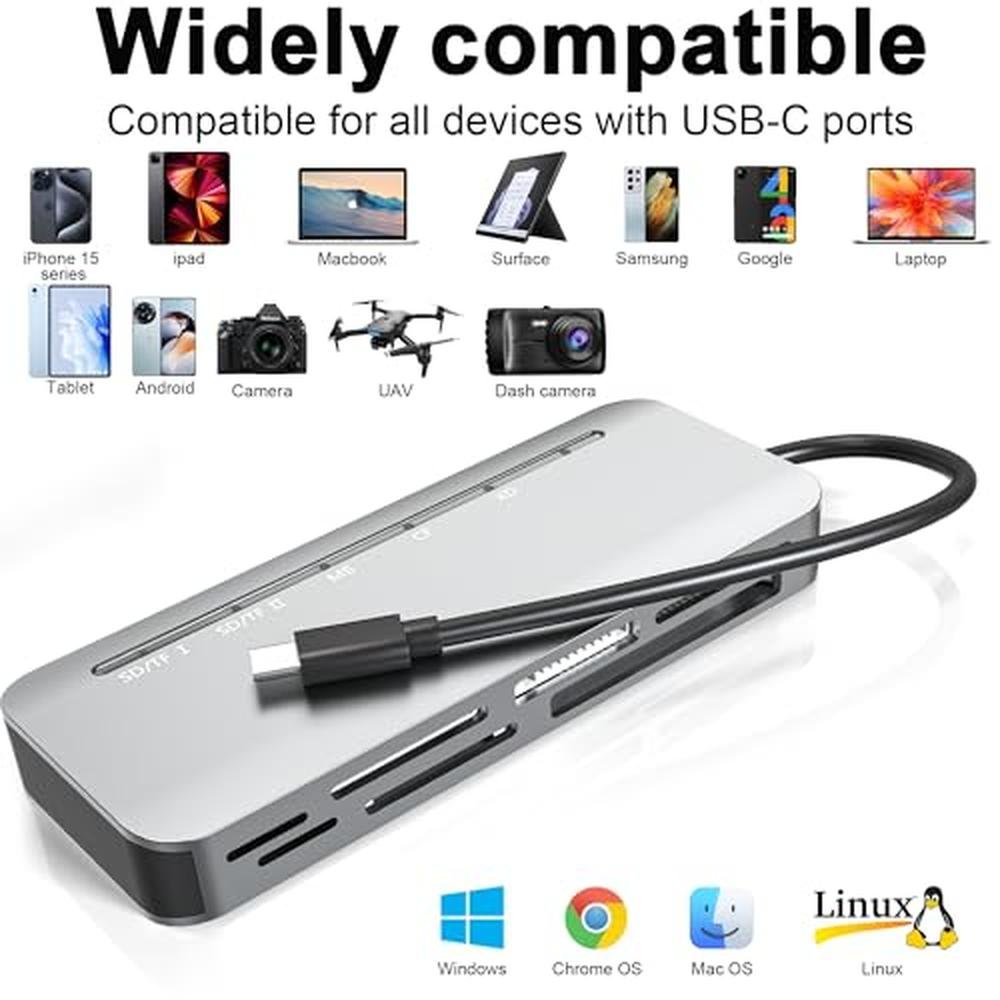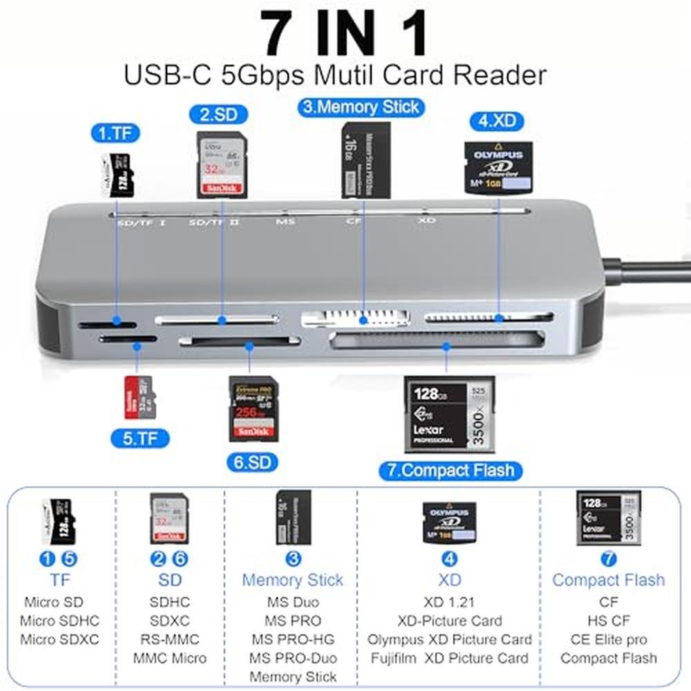 - Supports a wide range of memory cards, including SD, TF, CF, XD, and MS, for versatile storage options