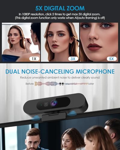 Indulge in exceptional video quality with the MOERTEK 4K Webcam for PC, boasting ultra 4K HD resolution and AI-powered auto framing for a flawless streaming experience. Equipped with advanced auto focus and dual noise-reducing microphones, this premium webcam ensures crystal-clear visuals and audio, making it ideal for high-end meetings and streaming. With its 5X digital zoom and 92° field of view, you can capture every detail with ease. The plug-and-play functionality allows for effortless setup, while the webcam's auto focus and zoom capabilities provide a hassle-free experience. Whether you're looking for a reliable webcam for professional meetings or streaming, the MOERTEK 4K Webcam is the perfect choice, offering superior image quality and unparalleled performance.