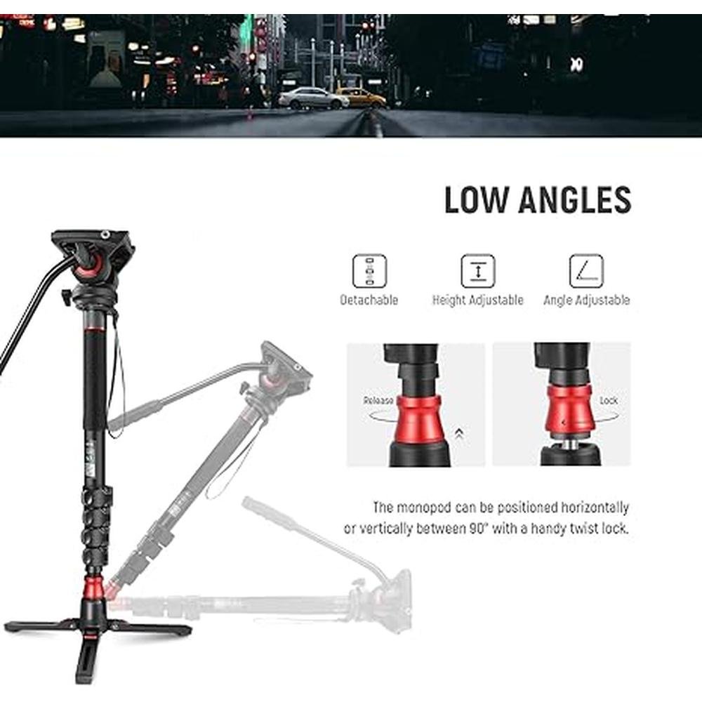 • Adjustable Multi Angle Monopod BaseWith a detachable and adjustable tripod base, the shooting monopod supports 360 swivel and 45 tilt, and can be positioned horizontally or vertically between 90. With a handy vertical locking knob, the feet support can hold steady on uneven ground, ideal for content creator, low angle shots, sports photography, weddings, travel vlogging , and urban landscapes. The tripod feet alone can also create a desktop tripod