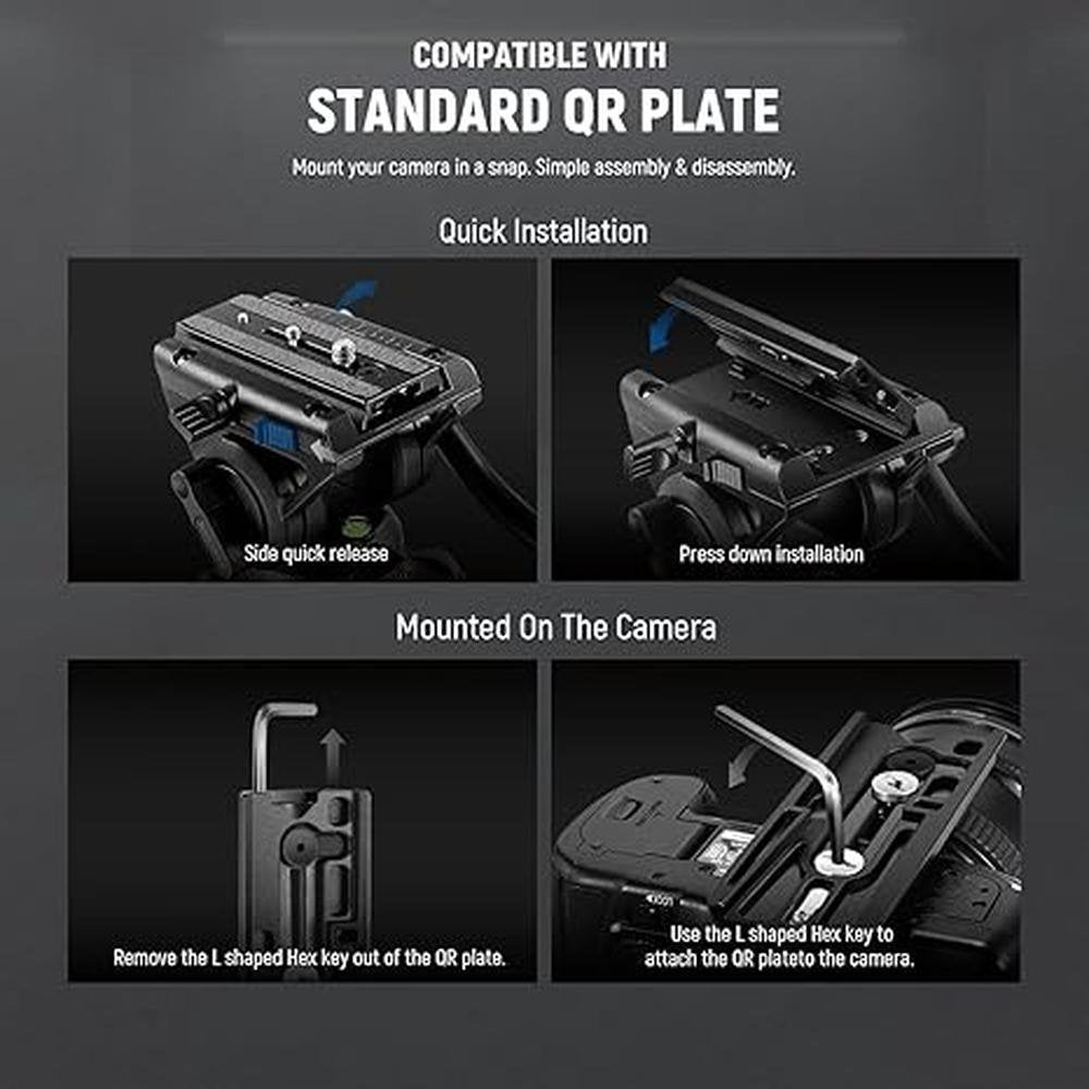 • Professional Fluid Video HeadDesigned with 360 pan and -7090 tilt movement, the fluid video head with a counterbalance system and damping control lets you take panoramic, low-angle, and overhead shots easily. It also features a side quick release design to enable fast and safe camera assembly and disassembly by pressing the side release button and adjusting the knob. A removable handle helps you smoothly pan the head while a bubble level keeps the horizon straight