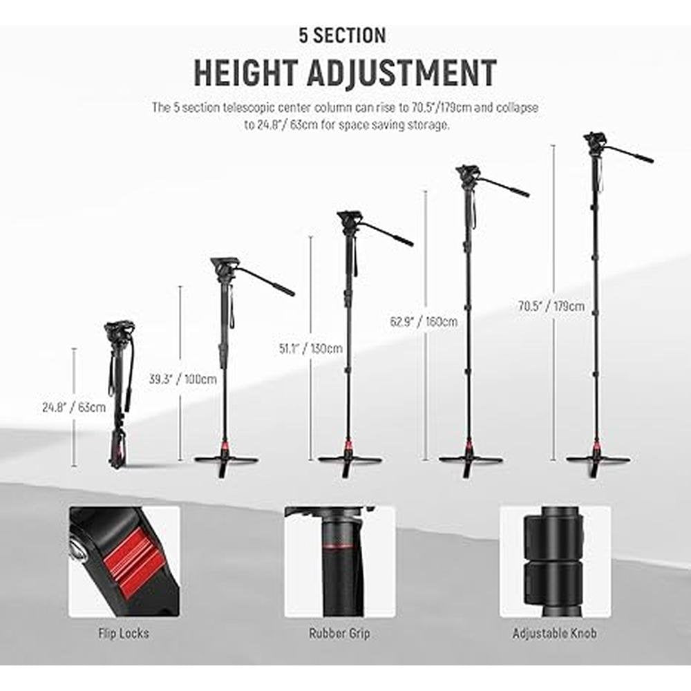 • Easy To Setup The 5 sections telescopic center column can rise to 70.5179cm and collapse to 24.8 63cm for space saving storage. Flip locks quickly secure the monopod firmly in place. High quality rubber grip ensures a comfortable and firm grip when in use, upgraded design for long life and professional photography accessories use