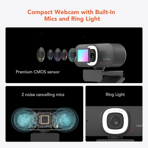Indulge in exceptional video quality with the NUROUM V15AFL 2K Webcam, expertly designed to deliver vibrant and crisp visuals with its 1080P 60fps resolution and 75° field of view. This premium webcam from NUROUM features a built-in 3-level adjustable ring light, ensuring you're always well-lit, and comes equipped with advanced noise-cancelling dual microphones for superior audio quality. With autofocus capabilities, this webcam is perfect for streaming, video conferencing, and online meetings on platforms like Zoom, Teams, OBS, and Xsplit. The plug-and-play functionality and lightweight design make it easy to use and transport.