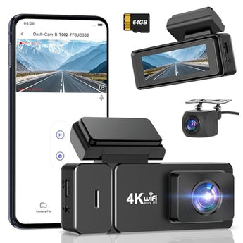 • Indulge in crystal-clear footage with 4K+1080P WiFi dual dash cam capabilities and a complimentary 64GB card
