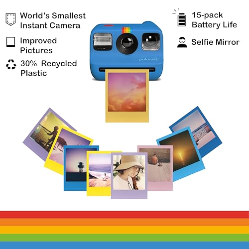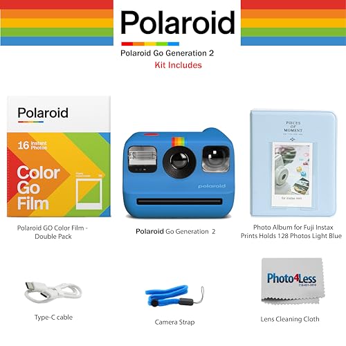 Experience the magic of instant photography with the Polaroid Go Generation 2 Instant Film mini Camera, now available in blue and bundled with a range of exciting accessories. This exclusive bundle includes a Polaroid GO Color Film Double Pack, perfect for capturing life's precious moments with polaroid film. The bundle also features a photo album that can hold up to 64 of your favorite photos, keeping them safe and organized, and a lens cleaning cloth to ensure your camera stays in top condition. Whether you're looking for a unique way to express your creativity or seeking a high-quality instant camera, this Polaroid Go camera bundle has everything you need to get started. With its compact design and advanced features, you can capture real life on the go. Polaroid's most portable, wearable, and take-anywhere instant camera has been upgraded with a large aperture range, precise light sensor, and on-point-exposure settings to make your pictures even better. It's really small but comes with big creative potential, featuring a selfie mirror, self-timer, double exposure, and can be paired with its own teeny tiny color filters. All in the classic design, and now made with 30% recycled materials. Compatible with Polaroid Go film, the smallest Polaroid instant film format.