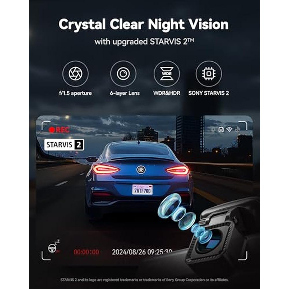 The F7N Pro's advanced imaging technology is further enhanced by its Super Night Vision and WDR HDR features. Equipped with an F1.5 aperture and 6 layers of precision optics, this dash cam wireless delivers superior low-light performance, ensuring clear recordings even in challenging outside nighttime conditions. The WDR HDR function automatically adjusts exposure to maintain optimal image quality, regardless of changing lighting conditions.