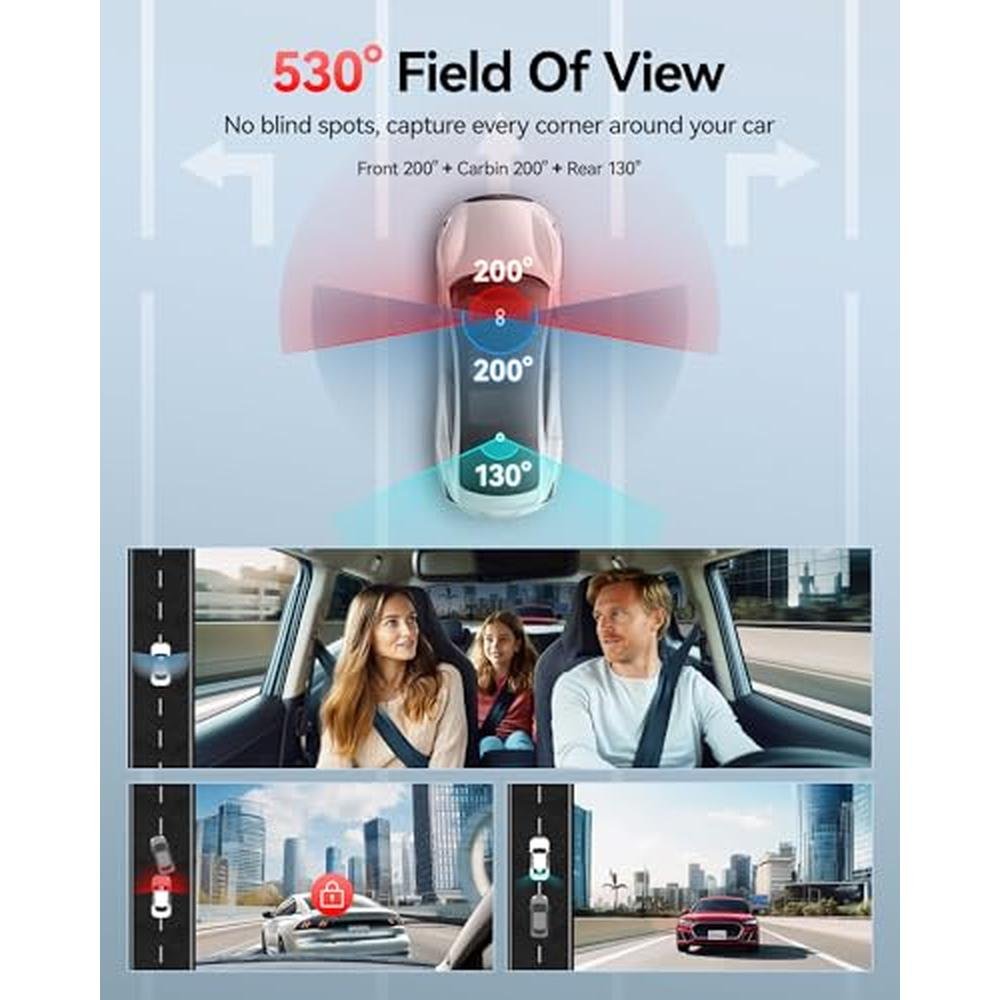 | Special features | 3 Channel Front and Rear Inside, 4 IR Lights, 18-Month Reliable Warranty, 530 Degree, APP Control, Built-In Display, Built-In GPS, Built-In Supercapacitor, Built-In wiFi, Compact Design, G-Sensor, Internal Memory, Loop Recording, Night Vision, Parking Monitor, OTA Firmware Update, Audio Recording, Touch Screen |