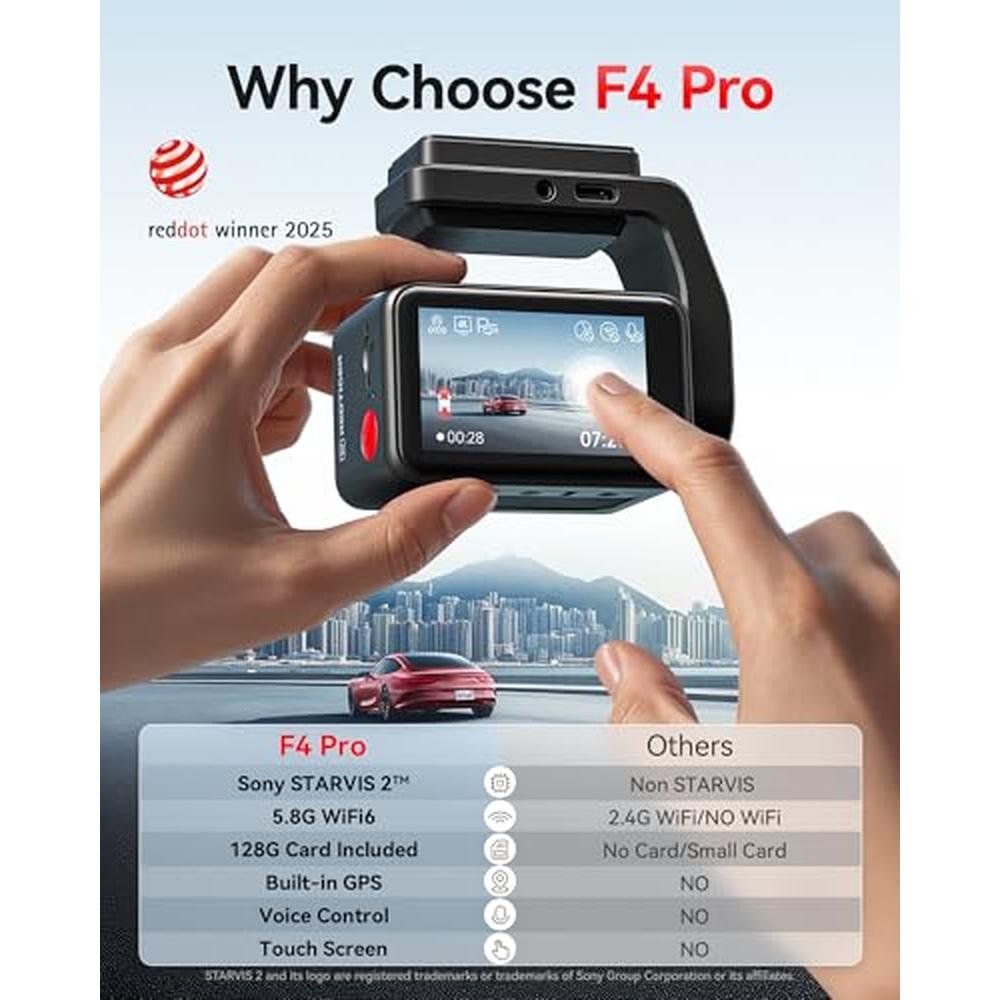 Dual-Mode Parking Monitoring offers 24/7 protection with two modes: collision lock mode and time-lapse mode. Smart & Convenient Operation with hands-free voice control and a 2.2-inch touch screen makes the car dash camera 4K F4 Pro easy to operate. Loop Recording & Free 128GB Card ensures uninterrupted recording by overwriting old footage. The included 128GB card provides ample storage for hours of 4K videos.