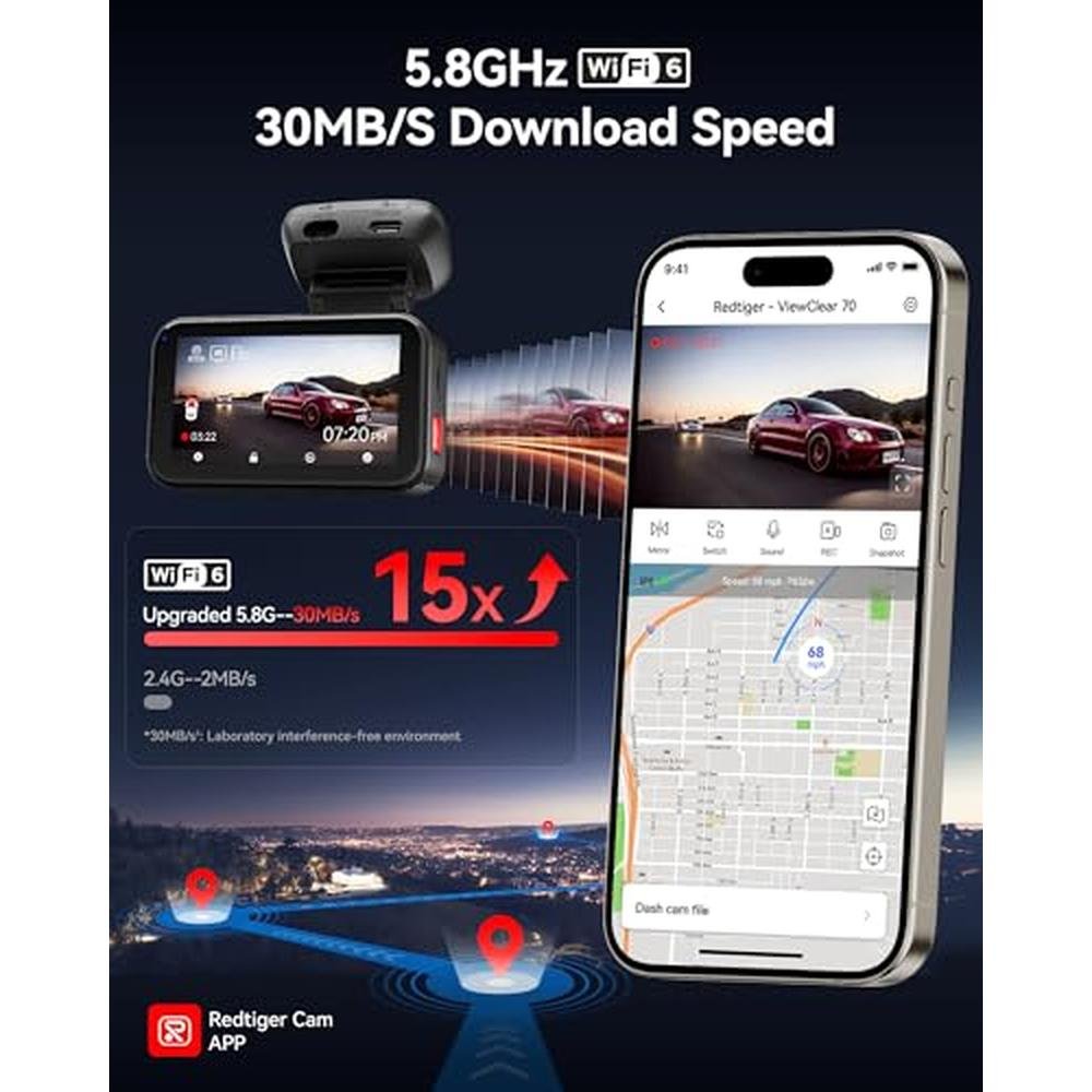 Experience the pinnacle of dash cam technology with the REDTIGER ViewClear 70, a premium dash cam that offers unparalleled video quality and features. With its 4K+2.5K resolution and STARVIS 2 IMX678 x Noctura Sensor, this dash cam captures every detail on the road, even in low-light conditions, thanks to its Dual HDR Hyper Night Clarity technology. Enjoy fast and seamless connectivity with 5.8GHz WiFi 6, allowing for 30MB/S fast download speeds, making it easy to transfer footage to your device. The REDTIGER ViewClear 70 also features a touch screen and voice control, allowing for hands-free adjustments and a responsive user interface.
