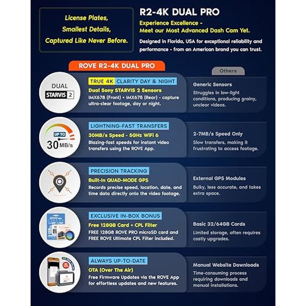 | Whats in the box | 6.5M Type-C Rear Camera Cable, 12FT Type-C Power Cable, DUAL USB Fast Car Charger, Car Wiring Tool, 5x Cable Clips, 1x Front + 1x Rear Electrostatic Films, 2x Wet Cleaning Pads, 2x Spare Sticky Tapes, Dash Cam Window/Bumper Sticker, Microfiber Lens Cleaning Cloth, User Manual, Quick Start Guide, Registration Card, R2-4K DUAL PRO Dash Cam (Front), 1x Rear Cam, ROVE PRO 128GB microSD Card, ROVE Ultimate CPL Filter, Windshield Suction Mount, Spare 3M Sticky Mount |