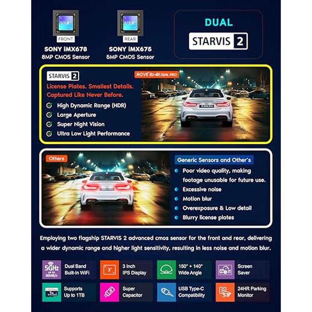 Experience next-level protection with the ROVE R2-4K DUAL PRO, a powerful 4K dual dash cam front and rear that captures every moment with precision and clarity. This premium dual dash cam records in True 4K UHD (2160P) from the front and 2K QHD (1440P) from the rear, using Sonys latest STARVIS 2 sensors IMX678 (Front) and IMX675 (Rear) for superior night vision and reduced motion blur in all lighting conditions. Whether you need a car dash camera for daily commutes or a dash cam for semi trucks, ROVE delivers unmatched video quality with F1.7 front and F1.55 rear apertures, ultra-wide 150 + 140 lenses, and enhanced HDR imaging to capture license plates, road signs, and surroundings with clarity.