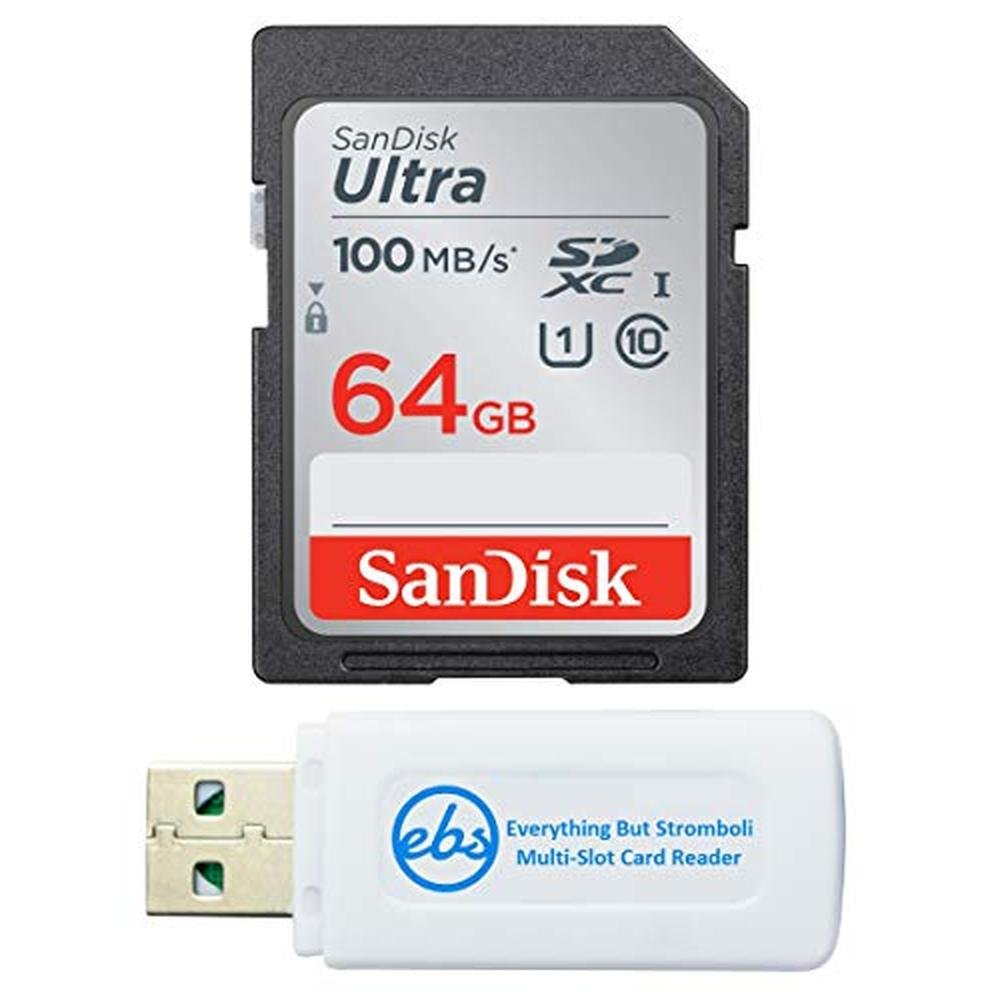 - Bundle includes (1) SanDisk SD Ultra 64GB Memory Card and (1) Everything But Stromboli Multi-slot Card Reader - Includes SD, MicroSD, M2, and MS slots for easy transfer