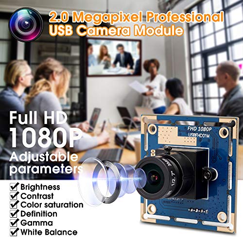 The HD 1080P USB CMOS board camera module is ideal for various applications, including security systems, portable video systems, video calls, industrial machine monitoring, and toys. It utilizes high-quality image sensors made by OmniVision, a world leader in electronics. The USB camera module is perfect for equipment manufacturers, experimenters, and hobbyists.