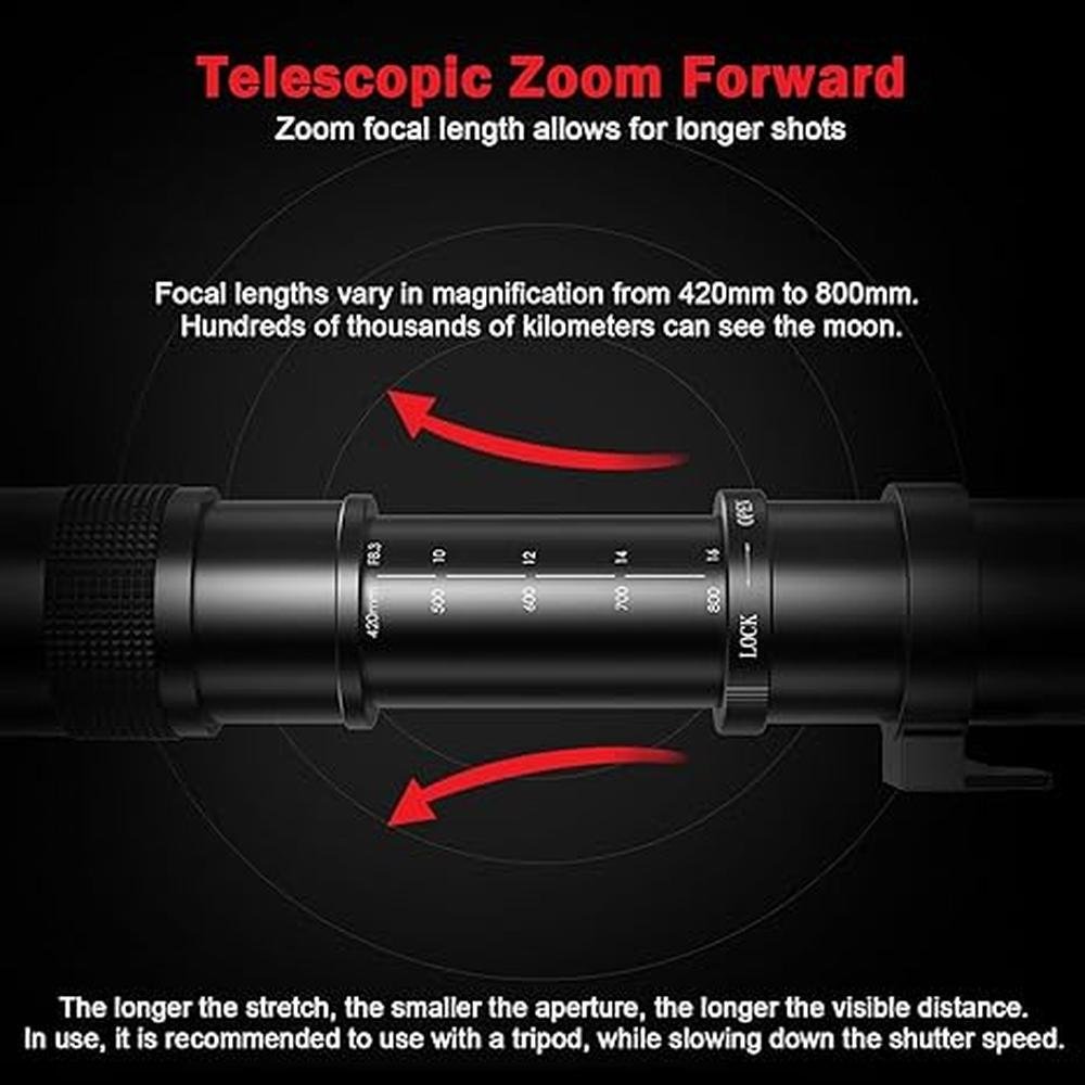 - With a focal length range of 420-800mm, our telephoto lens offers unparalleled flexibility and versatility, allowing photographers to capture a wide range of subjects, from wildlife to landscapes, with ease and precision.