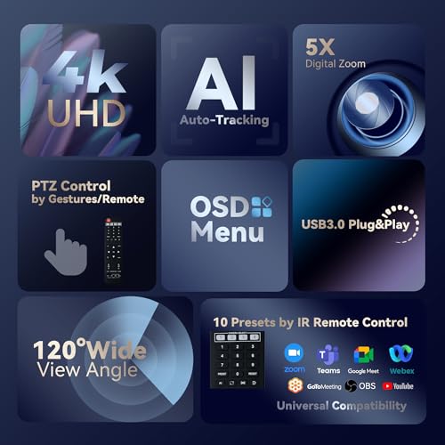 Special Features | PTZ Camera with 4K 30fps, AI Auto-tracking, Gestures/Remote control, 5X digital zoom, 120 wide-angle FOV, USB3.0 plug and play, RS232/RS485 Support |