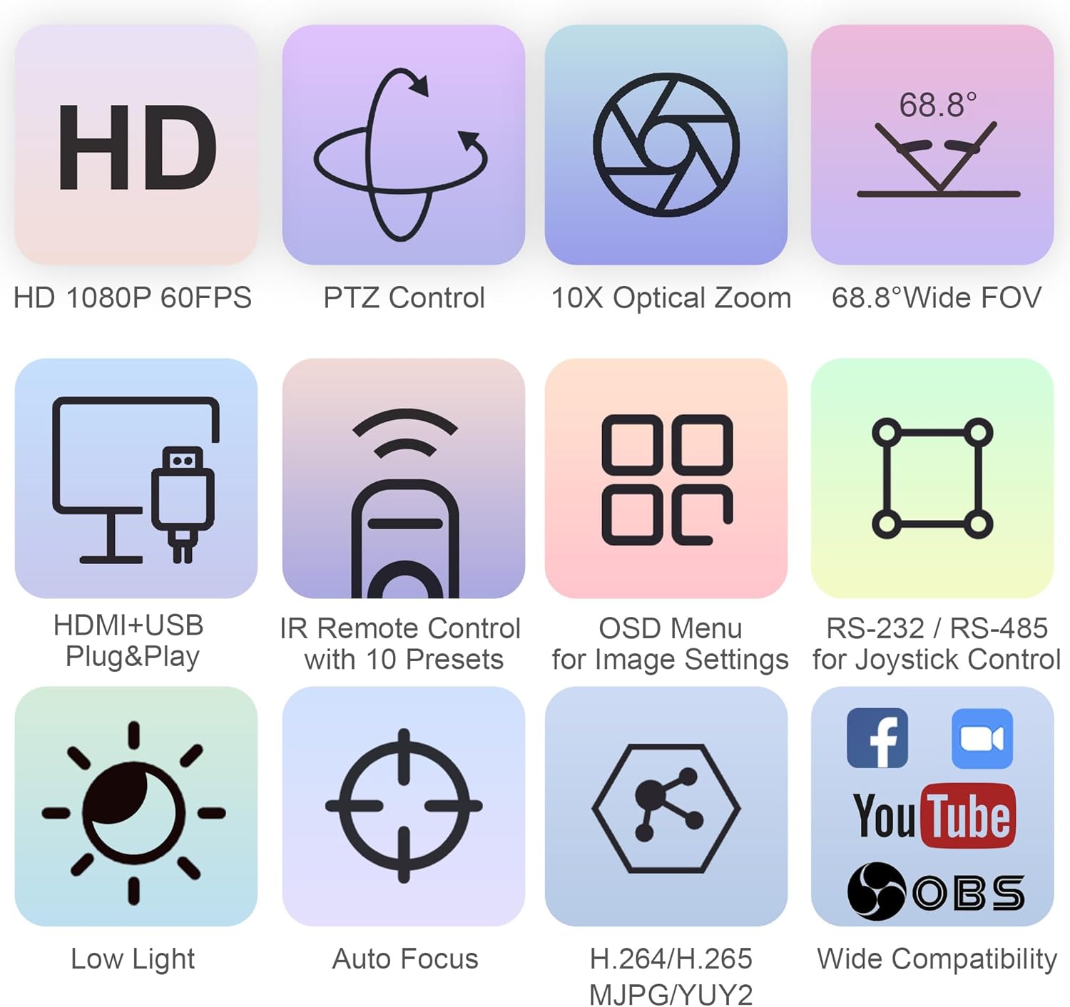 - ✔1080P 60fps 10X Optical Zoom - It is equipped with a 1/2.8 inch HD Color CMOS with 2.38 megapixel(16:9), Full HD 1080p output resolution and high dynamic image of 60fps. The superior 10x optical zoom lens has a wide angle FOV of 62.8°(W)-7.8°(T) without distortion, which has excellent white balance and exposure mode. The menu of the remote control can set picture parameters. Recommended for a Medium to Large church or meeting room.