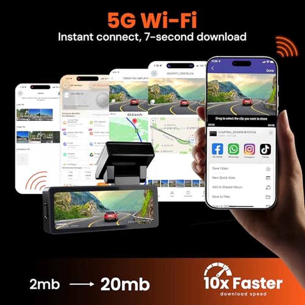 TORVO 4K Dash Cam | Front and Rear Camera System with 64GB Card | 5G WiFi, GPS, and Night Vision