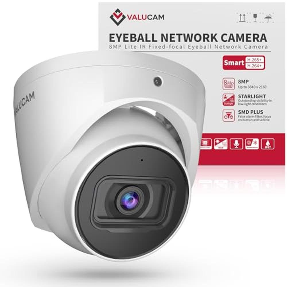 • VALUCAM 8MP IP Network PoE Camera with starlight sensor - This 4k poe camera adopts 0.009Lux F2.0 aperture starlight sensor, Presenting more details even under low illuminance, Built-in IR LED enables max 98ft(30m) night vision distance. Equipped for flexibility with support for both 12V DC, PoE Injector or Switch(Not included).