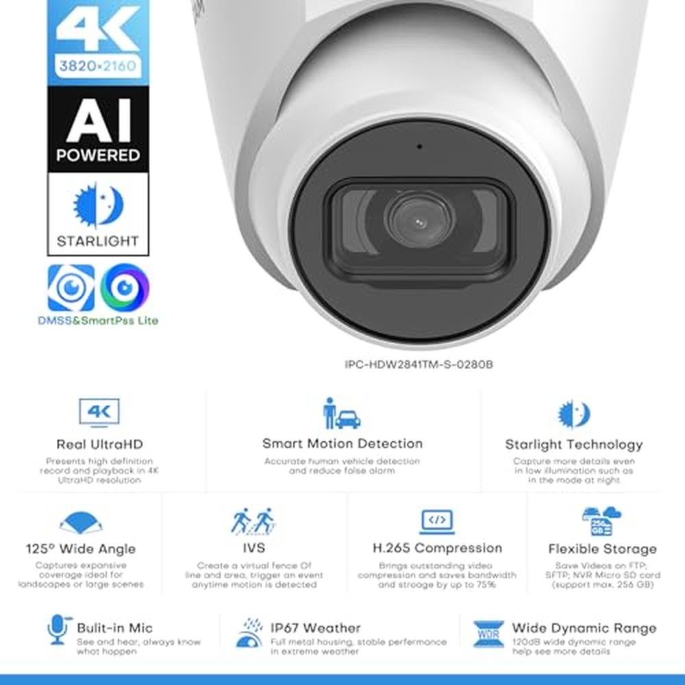 VALUCAM 8MP IP Camera, DMSS SmartPSS Lite, 4K PoE Turret Outdoor Starlight Camera with Mic Audio, Human Vehicle Detection, IVS, Intrusion Tripwire Alarm, 2.8mm 125 Wide Angle, Metal IP67, H265 , 256GB