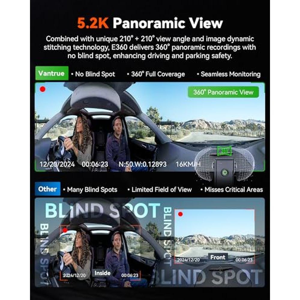 Dual Fisheye | Vantrue E360 5.2K 2 Channel Dash Cam 360 Degrees | Advanced Dual STARVIS 2 Sensors