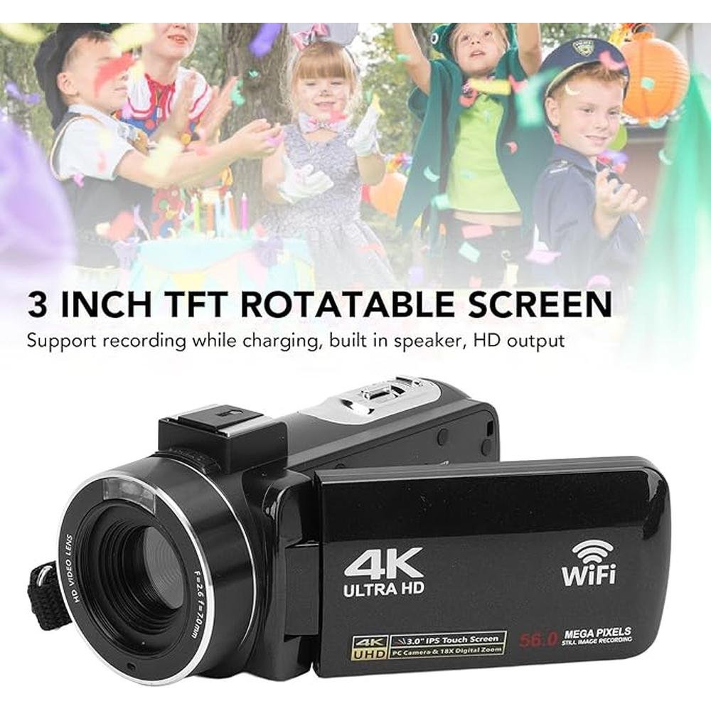 - Rotatable Touchscreen Camera The digital camera can catch excellent 56MP photos and 4K videos with 18x digital zoom. Enjoy clear playback on the 3 inch TFT rotating touchscreen and high definition output speaker.