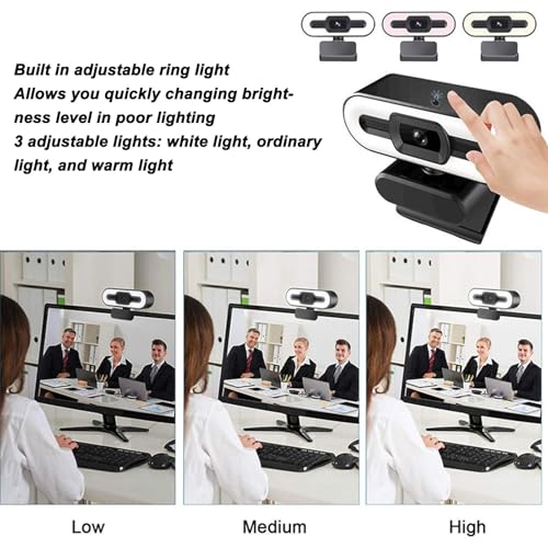 • The webcam has an adjustable ring light with three modes: cool light, ordinary light, and warm light, allowing for optimal illumination in various environments