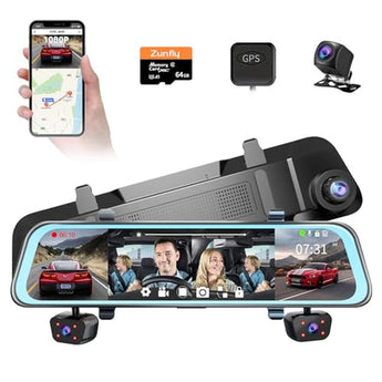 Elevate your driving experience with the Zunfly 4 Channel Mirror Dash Cam, a superior, high-performance mirror dash cam designed to provide unparalleled protection and visibility on the road. With its advanced features, including WiFi, GPS, and IR night vision, this mirror dash cam is the perfect choice for those seeking a deluxe, top-tier driving solution. Whether you're looking for a high-end rear view mirror camera or a premium-grade dash cam, the Zunfly 4 Channel Mirror Dash Cam is the ultimate solution.