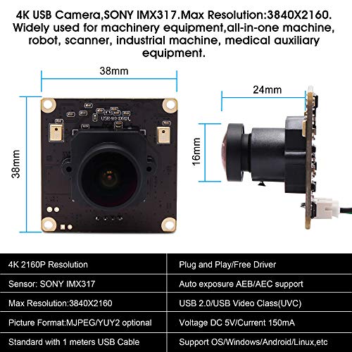 The IMX317 camera module has a maximum resolution of 3840x2160, supports MJPEG and YUY2 formats, and has a frame rate of up to 30fps. It also features a rolling shutter, USB2.0 connector, and supports Windows XP, Vista, 7, 8, Linux, and MAC-OS X 10.4.8 or later. With its compact design and low power consumption, this camera module is perfect for industrial, medical, and scientific applications.
