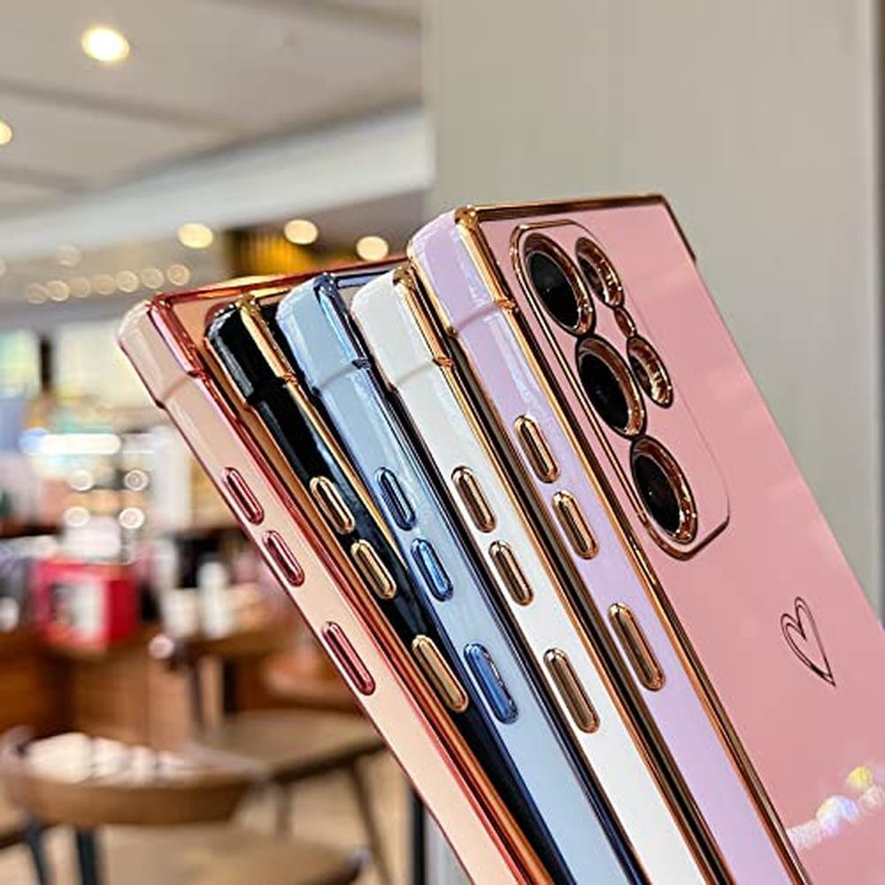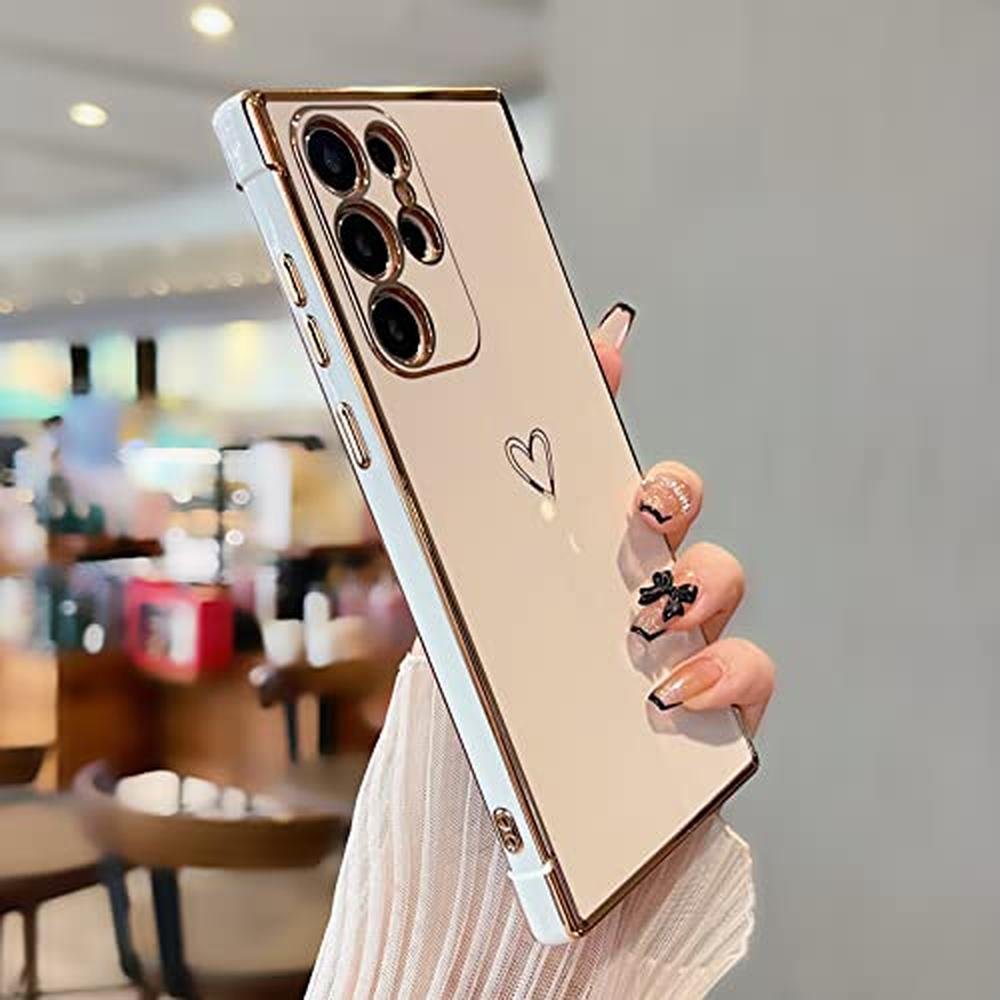 DEFBSC Compatible with Samsung Galaxy S25 Ultra Case with Gold Heart, Luxury Plating Edge Bumper Cute Case with Full Camera Protection for Women Girls, Anti-Scratch Shockproof Phone Cover, White