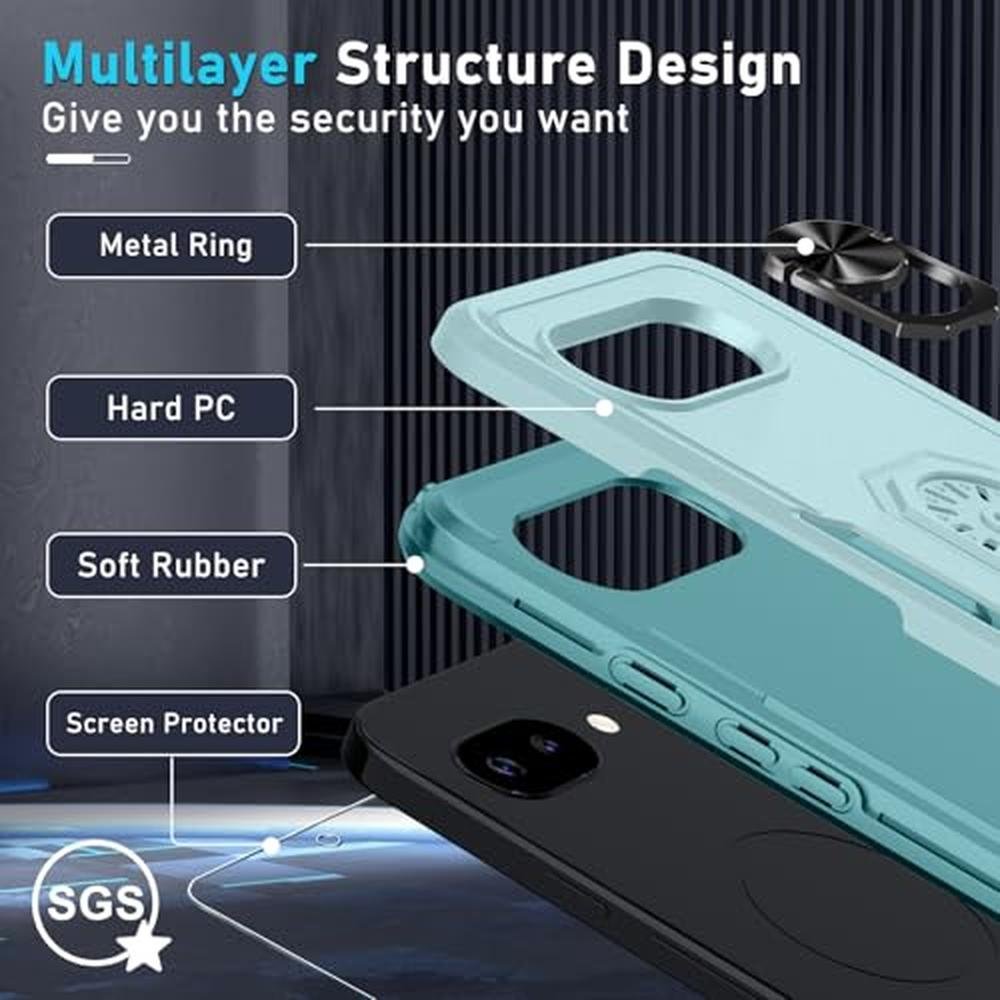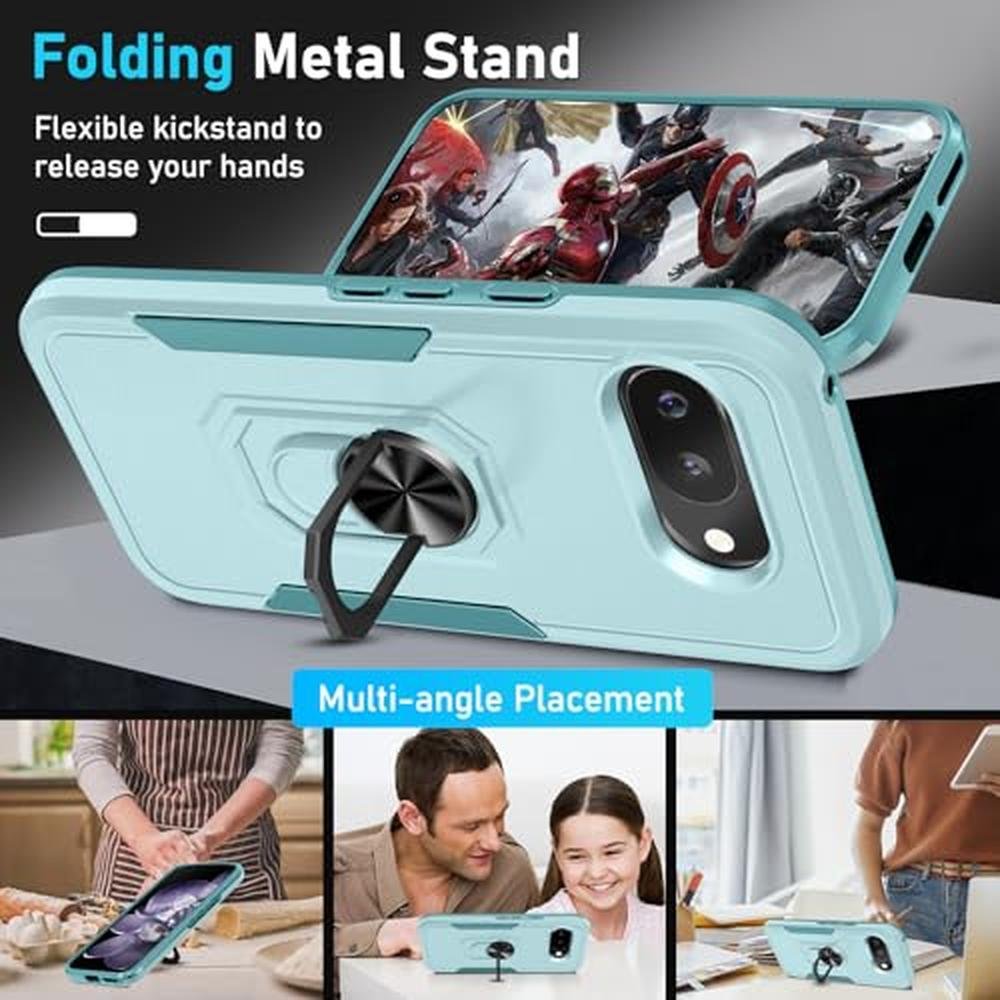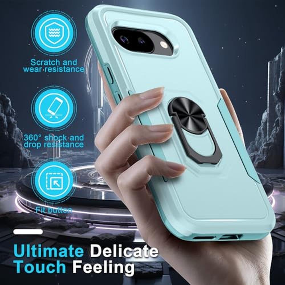 for Google Pixel 9a Case with Screen Protector+Camera Lens Protector,Heavy Duty Shockproof Full Body Protective Cover Built in Rotatable Metal Ring Holder Kickstand,2025 Mint Green