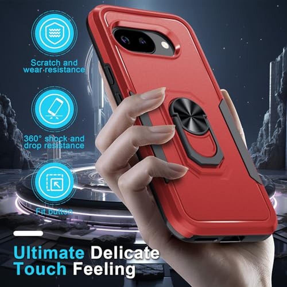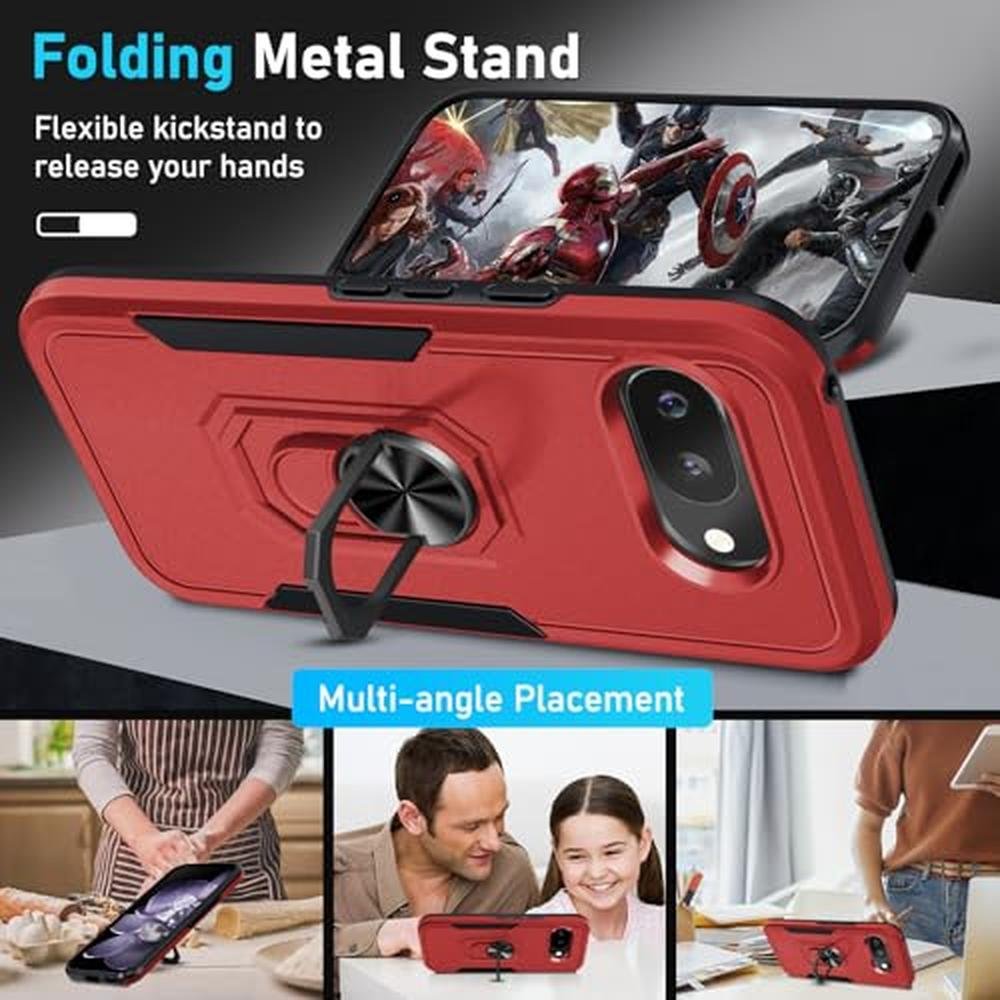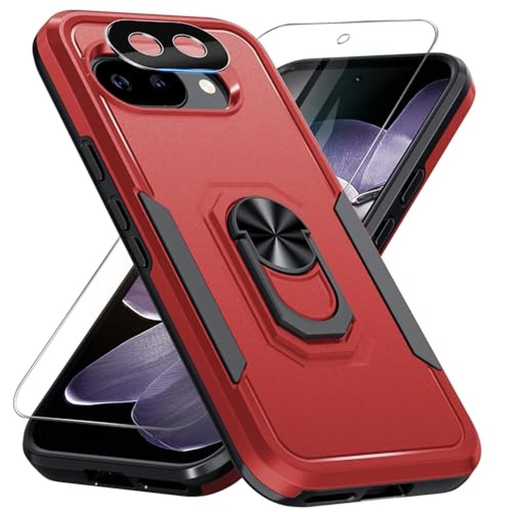 for Google Pixel 9a Case with Screen Protector+Camera Lens Protector,Heavy Duty Shockproof Full Body Protective Cover Built in Rotatable Metal Ring Holder Kickstand,2025 Red