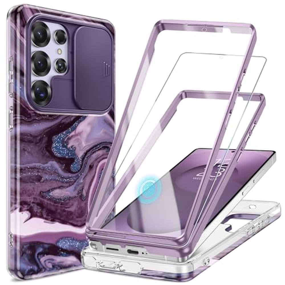 GVIEWIN for Samsung Galaxy S25 Ultra Case, [Slide Camera Cover & Built-in HD Screen Protector] [2 Front Frames] Shockproof Military Grade Protective Marble Phone Case 6.9" (Quicksand/Purple)