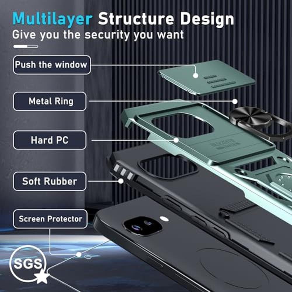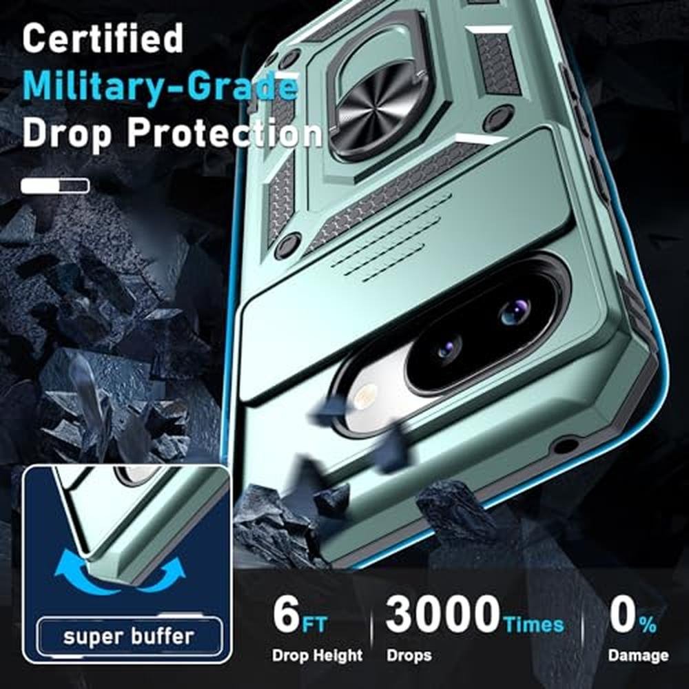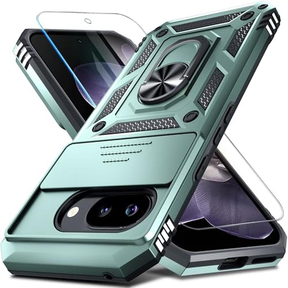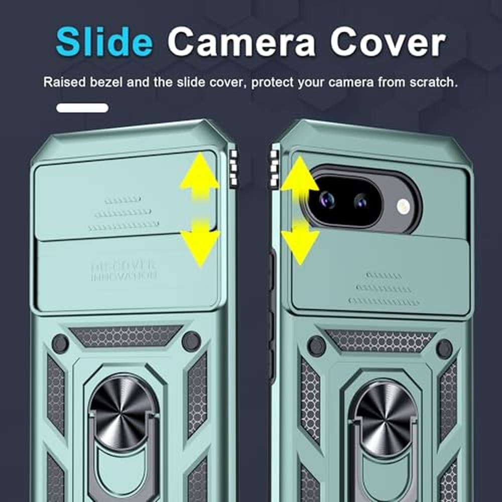 Janmitta Case Compatible with Google Pixel 9A Built in Slide Camera Lens Cover+Screen Protector+Finger Ring Holder Kickstand,Heavy Duty Shockproof Full Body Protective Phone Cover,Dark Green
